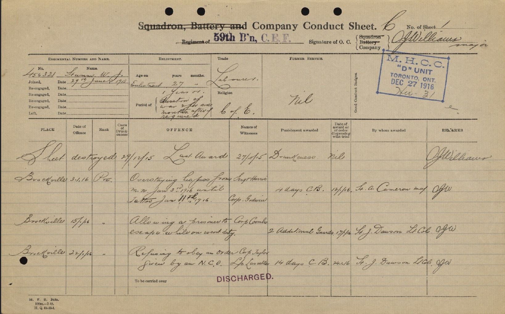 It appears he did not readily adapt to military life as he was put on charges while serving in Canada 9 times.