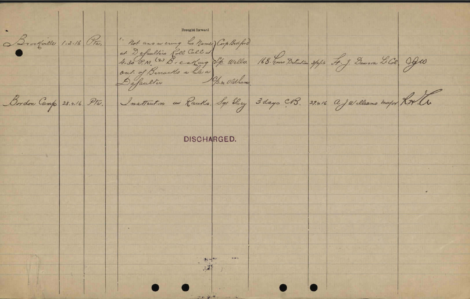 - Inattention in Ranks, 28 April 1916, Borden Camp, Ontario.