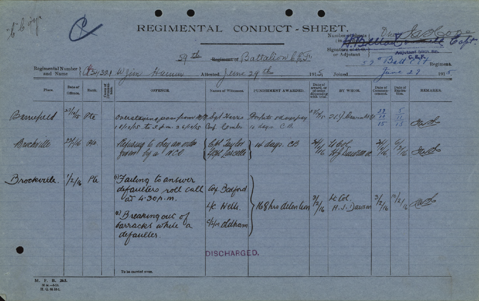 -Failing to answer defaulters roll call, 1 February 1916, Brockville, Ontario - Breaking out of barracks while a defaulter, 1 February 1916, Brockville, Ontario,