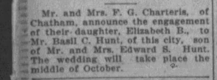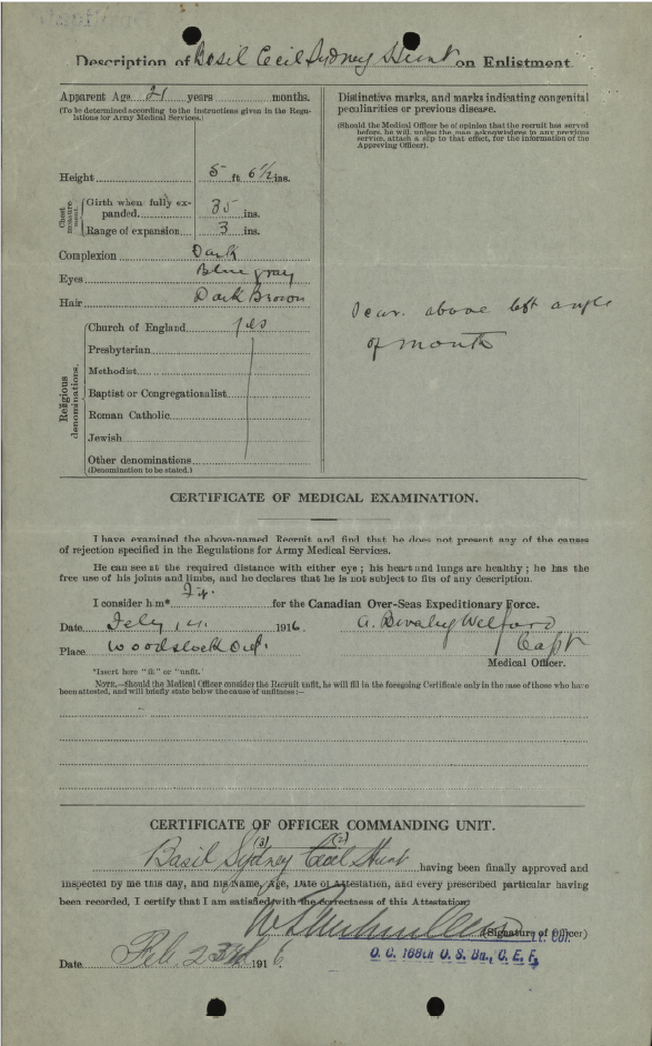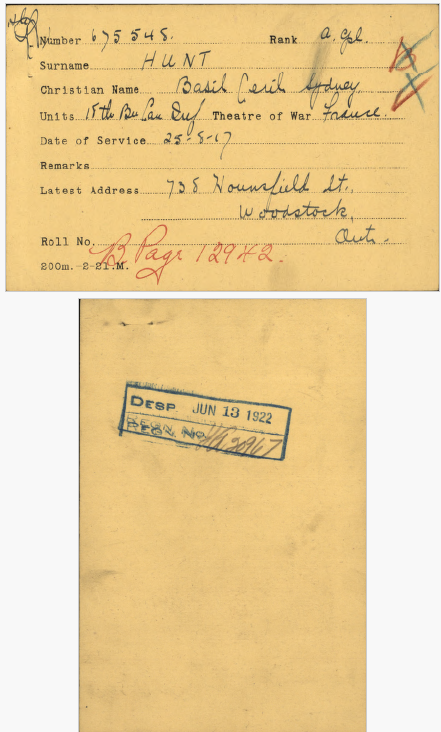 Family Search: When Private Basil Cecil Sidney Hunt was born on 26 August 1894, in Beachville, Oxford, Ontario, Canada, his father, Edward Spencer Hunt, was 38 and his mother, Constance Adeline Marman, was 34. He had at least 1 son with Carolyn L. Charteris. He immigrated to Ellis Island, New York City, New York, United States in 1920 and lived in North Oxford Township, Oxford, Ontario, Canada in 1911 and Hamilton, Hamilton-Wentworth, Ontario, Canada in 1931. He died on 12 December 1967, at the age of 73, and was buried in Woodland Cemetery, Hamilton, Ontario, Canada.