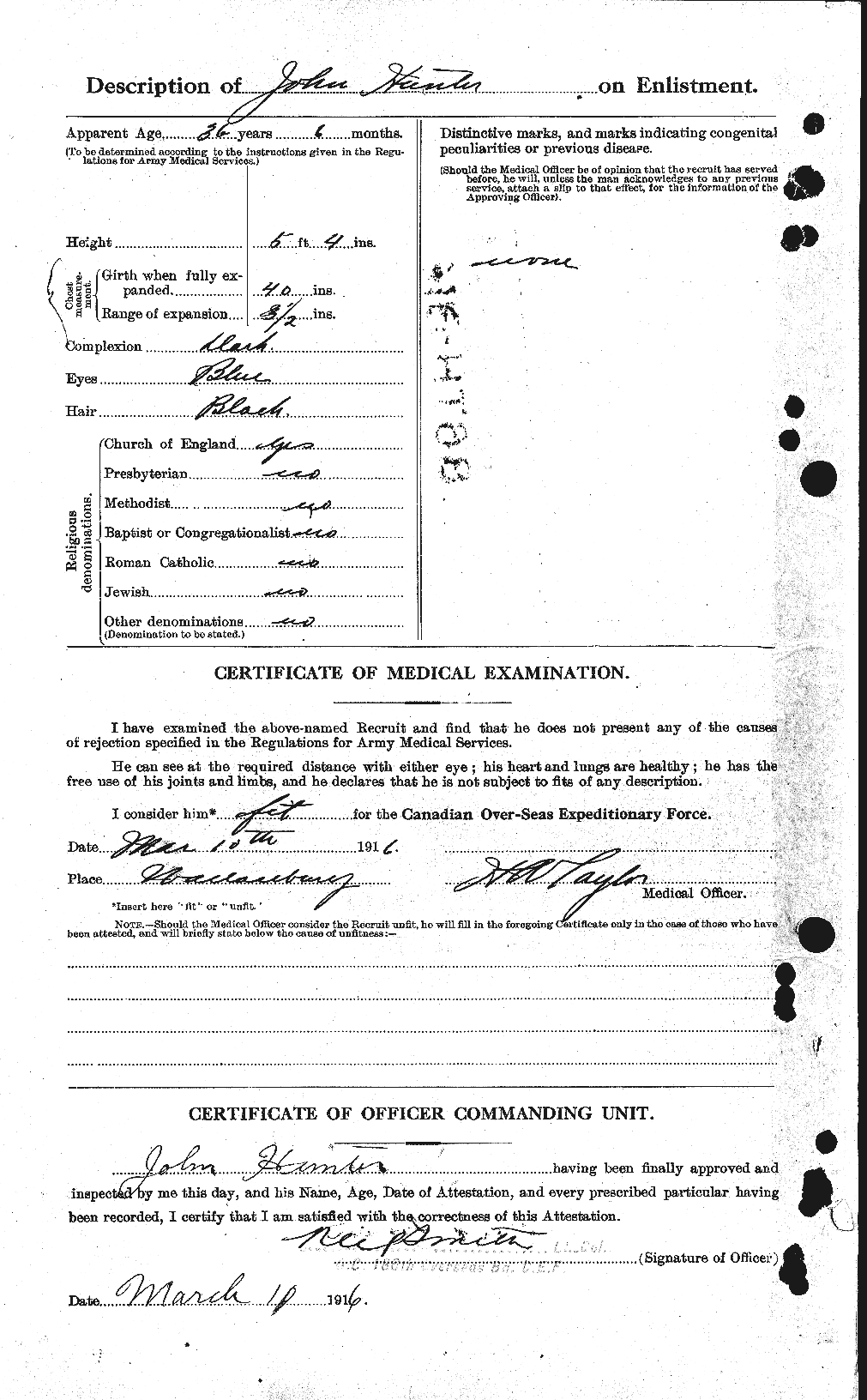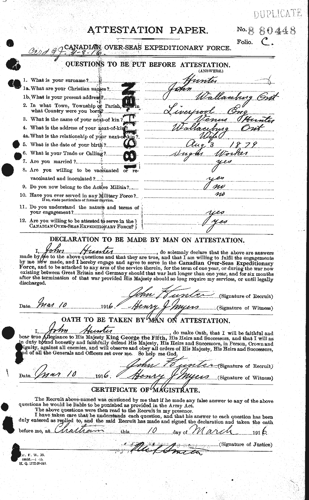Family Search: Private John Hunter was born on 3 August 1879, in Liverpool, Lancashire, England, United Kingdom as the son of Peter Hunter and Martha Workman. He married Venus Lewis on 26 April 1911, in Chatham, Kent, Ontario, Canada. They were the parents of at least 2 daughters. He immigrated to Canada in 1891 and lived in Kent, Ontario, Canada in 1911. He registered for military service in 1916. His occupation is listed as foreman, British Sugar Company Canada and Dominion Sugar Company in Chatham, Kent, Ontario, Canada. He died on 26 December 1956, in Chatham, Kent, Ontario, Canada, at the age of 77, and was buried in Chatham, Kent, Canada West, British North America.