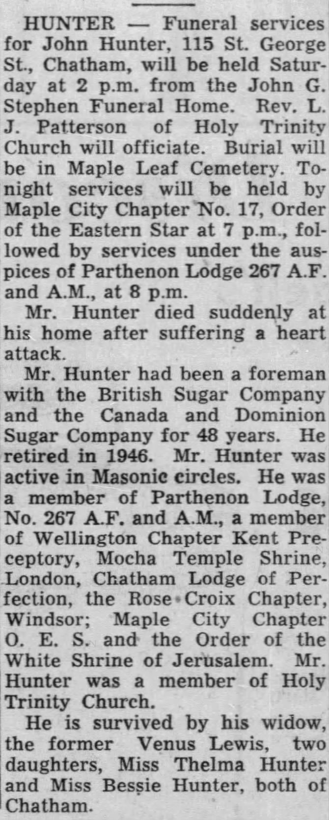 HUNTER – Funeral services for John Hunter, 115 St. George St., Chatham, will be held Saturday at 2 p.m. from the John G. Stephen Funeral Home. Rev. L. J. Patterson of Holy Trinity Church will officiate. Burial will be in Maple Leaf Cemetery. Tonight services will be held by Maple City Chapter No. 17, Order of the Eastern Star at 7 p.m., followed by services under the auspices of Parthenon Lodge 267 A.F. and A.M., at 8 p.m.