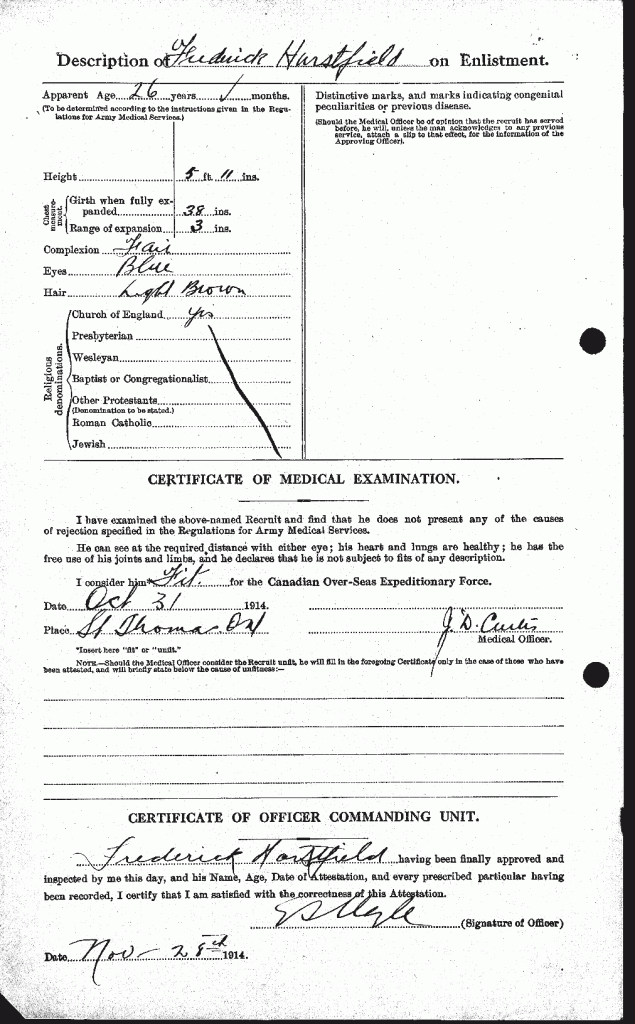 Surname spelled as Hurtsfield on Nominal Roll. Other documents show names as Hurtsfield.