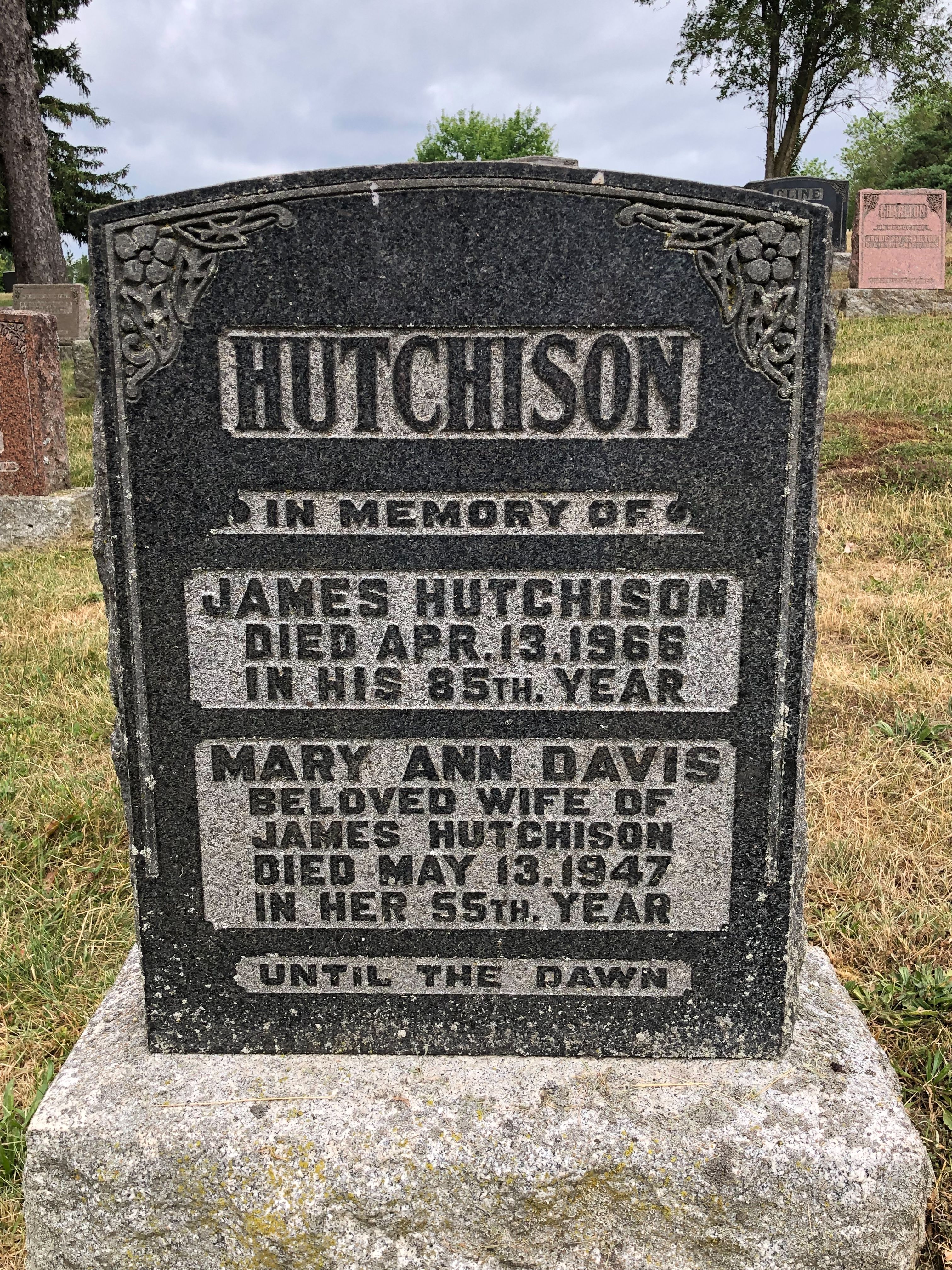 Family Search: Sergeant James Hutchinson was born on 28 November 1881, in Monifieth, Angus, Scotland, United Kingdom as the son of Margaret Hutchison. He immigrated to Canada in 1914 and lived in Galt, Waterloo, Ontario, Canada in 1915. He registered for military service in 1915. In 1915, at the age of 34, his occupation is listed as pipe layer in Galt, Waterloo, Ontario, Canada. He died on 13 April 1966, in London, Ontario, Canada, at the age of 84, and was buried in Mount View Cemetery, Cambridge, Waterloo, Ontario, Canada.