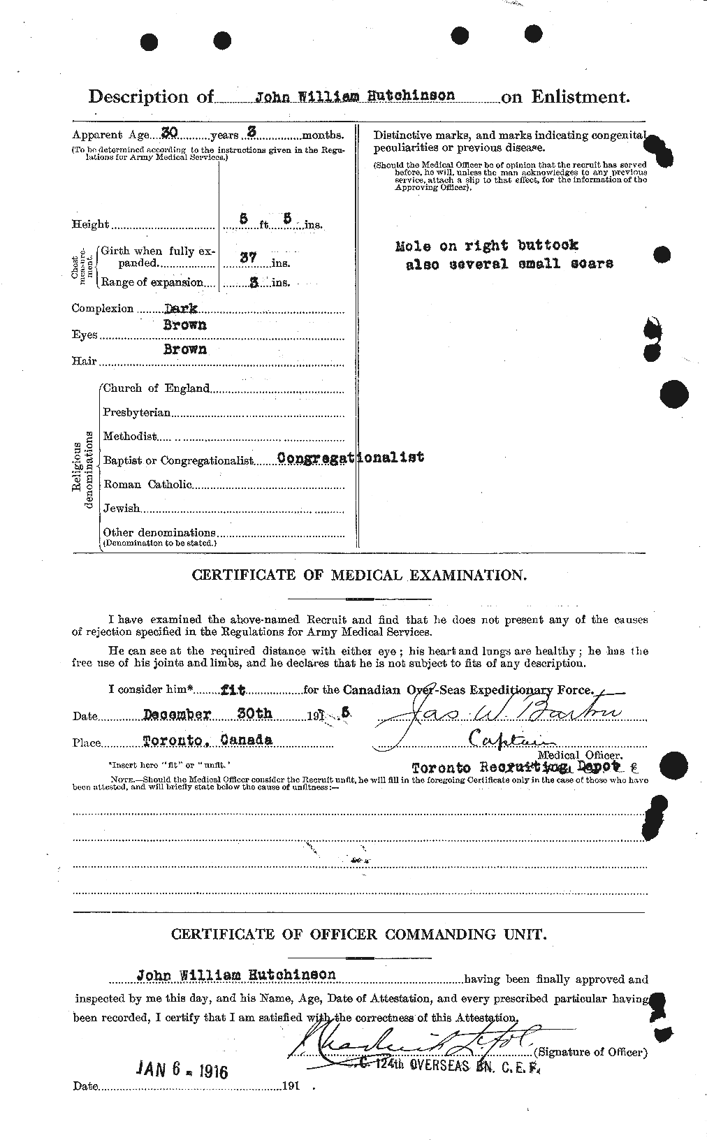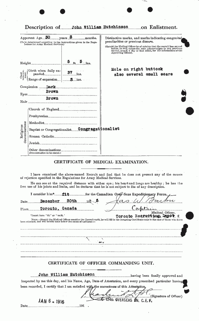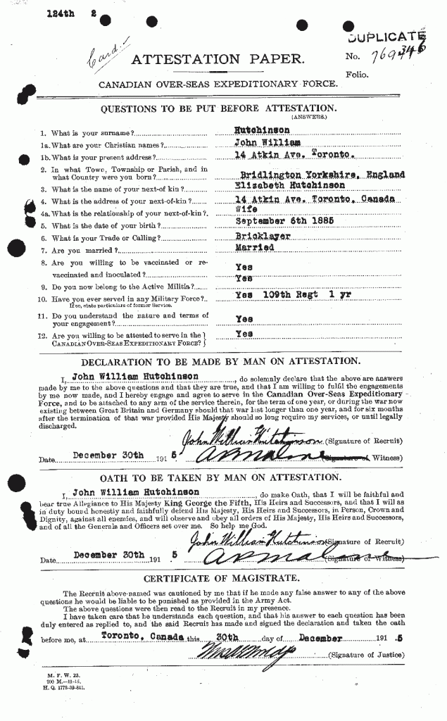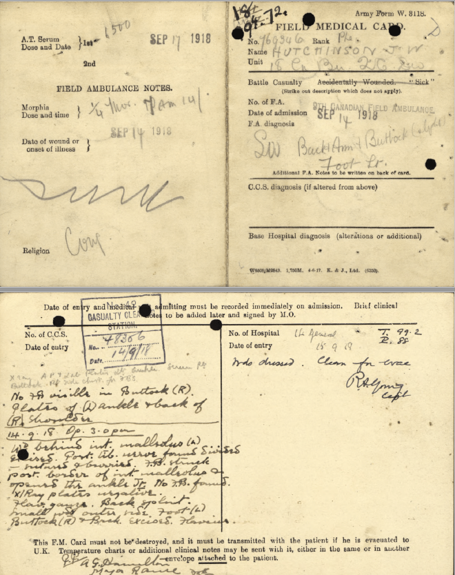 Hutchinson, John William: Service no. 769346 Digitized Service Record Source: Per news clipping post by David Archer at 18th Battalion Facebook Page (not group). Find-A-Grave Hutchinson, John William: Service no. 769346. Source: Toronto Telegram. November 1916. Via David Archer. Source: Toronto Telegram. September 1918. Via David Archer. Medical notes and field medical card from service record. Share this: Click to email a link to a friend (Opens in new window) Email Click to share on Facebook (Opens in new window) Facebook Click to share on X (Opens in new window) X Click to share on Reddit (Opens in new window) Reddit Click to share on LinkedIn (Opens in new window) LinkedIn Click to print (Opens in new window) Print Click to share on Tumblr (Opens in new window) Tumblr Click to share on Pocket (Opens in new window) Pocket Click to share on Pinterest (Opens in new window) Pinterest Click to share on Telegram (Opens in new window) Telegram Click to share on WhatsApp (Opens in new window) WhatsApp Like Loading...