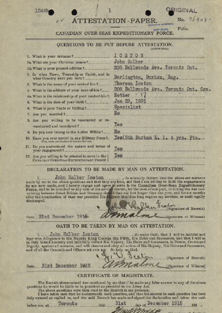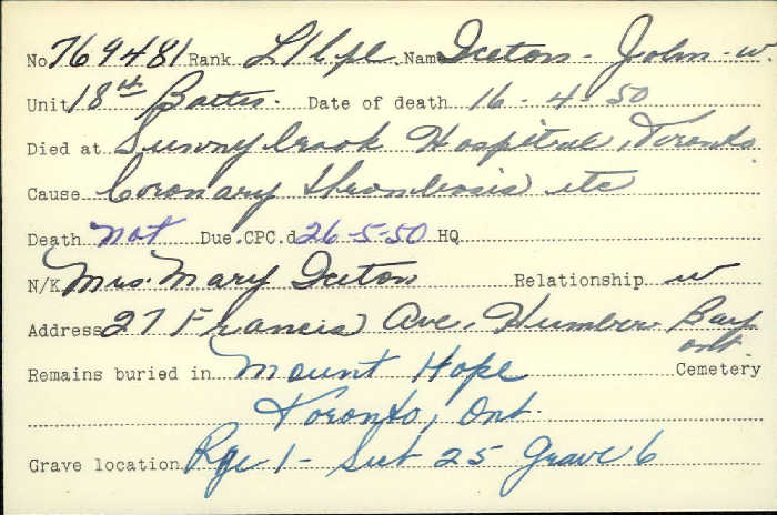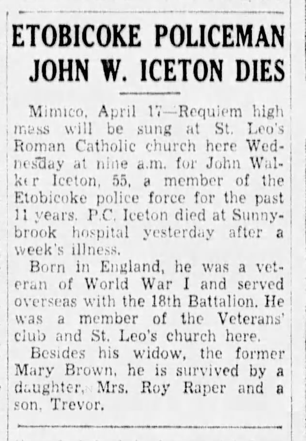 Family Search: When Private John Walker Iceton was born in 1891, in Darlington, Durham, England, United Kingdom, his father, James Walker Iceton, was 31 and his mother, Theresa Mary Robinson, was 31. He married Mary Brown on 12 November 1919, in York Township, Toronto, Ontario, Canada. They were the parents of at least 1 son and 1 daughter. He immigrated to Quebec City, Quebec, Canada in 1912 and lived in Toronto, York, Ontario, Canada in 1915. He registered for military service in 1915. In 1955, his occupation is listed as policeman in Etobicoke, Toronto, Ontario, Canada. He died on 16 April 1950, in Toronto, Ontario, Canada, at the age of 59, and was buried in Mount Hope Catholic Cemetery, Toronto, Ontario, Canada.
