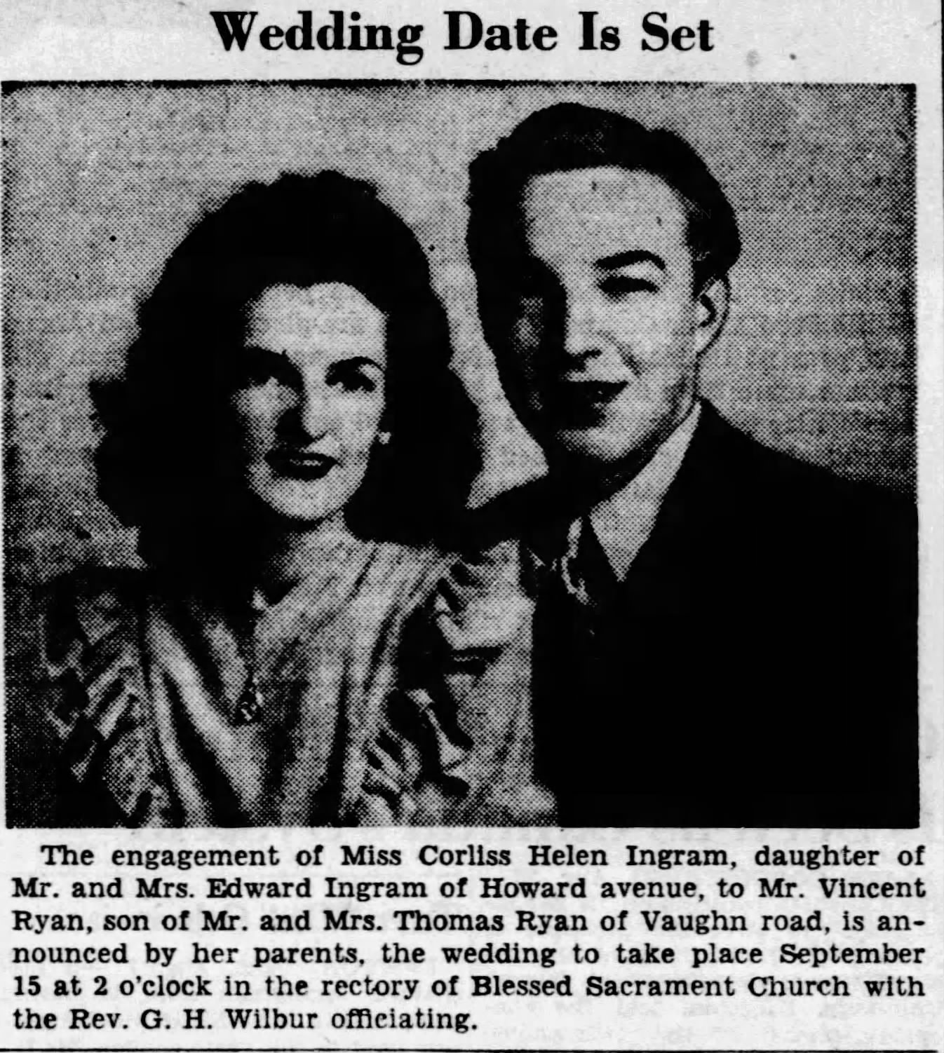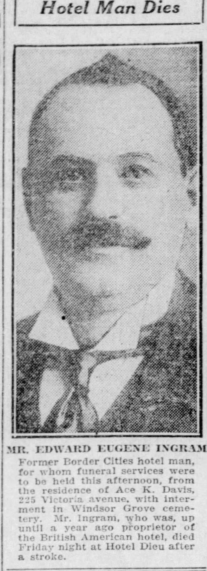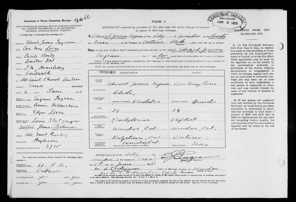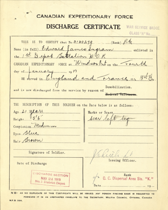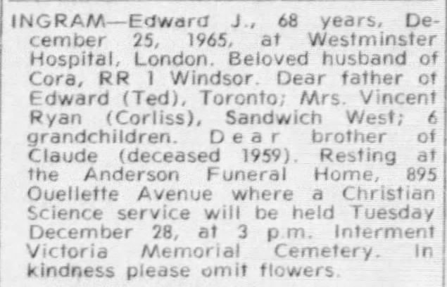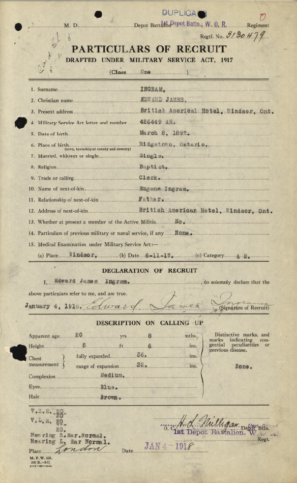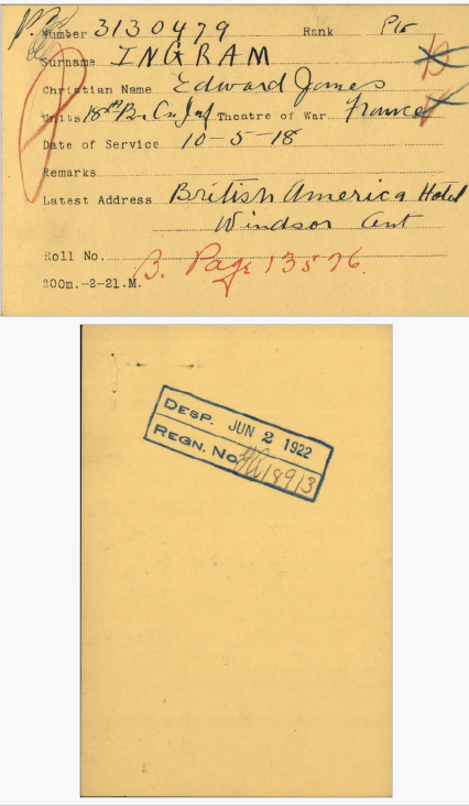 Family Search: When Private Edward Jerome Ingram was born on 8 March 1897, in Ridgetown, Kent, Ontario, Canada, his father, Eugene Edward Ingram, was 41 and his mother, Anna M Hildershine, was 23. He had at least 1 son and 1 daughter with Cora May Loree. He lived in Windsor, Sandwich, Essex, Ontario, Canada for about 13 years and Windsor, Essex, Ontario, Canada in 1956. He registered for military service in 1918. In 1931, at the age of 34, his occupation is listed as ambulance driver. He died on 25 December 1965, in London, Ontario, Canada, at the age of 68, and was buried in Victoria Memorial Gardens, Oldcastle, Essex, Ontario, Canada.