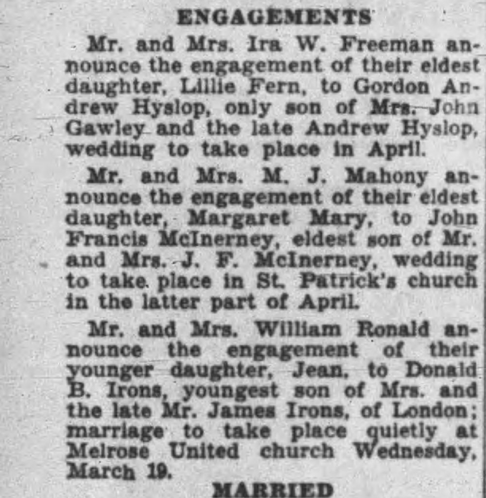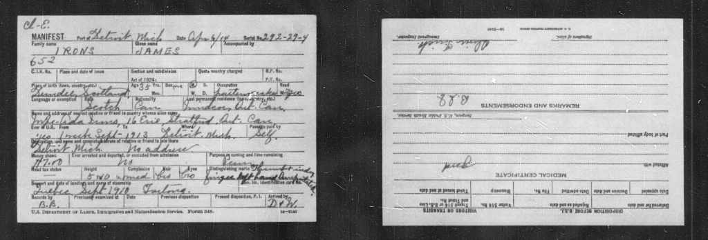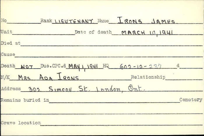 Family Search: Lieutenant James Irons was born on 2 July 1878, in Dundee, Scotland, United Kingdom. He married Ada Farrow on 9 October 1899, in West Ham, Essex, England, United Kingdom. They were the parents of at least 2 sons and 2 daughters. He immigrated to Canada in 1913 and lived in Leyton, Essex, England, United Kingdom in 1901 and London, Ontario, Canada in 1914. He registered for military service in 1914. In 1914, at the age of 36, his occupation is listed as carpenter in London, Ontario, Canada. He died on 10 March 1941, in London, Ontario, Canada West, British Colonial America, at the age of 62, and was buried in Woodland Cemetery, London, Ontario, Canada.