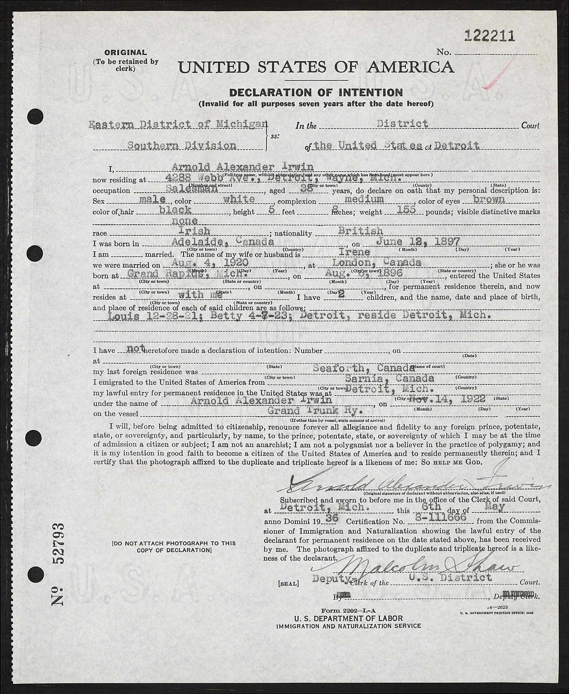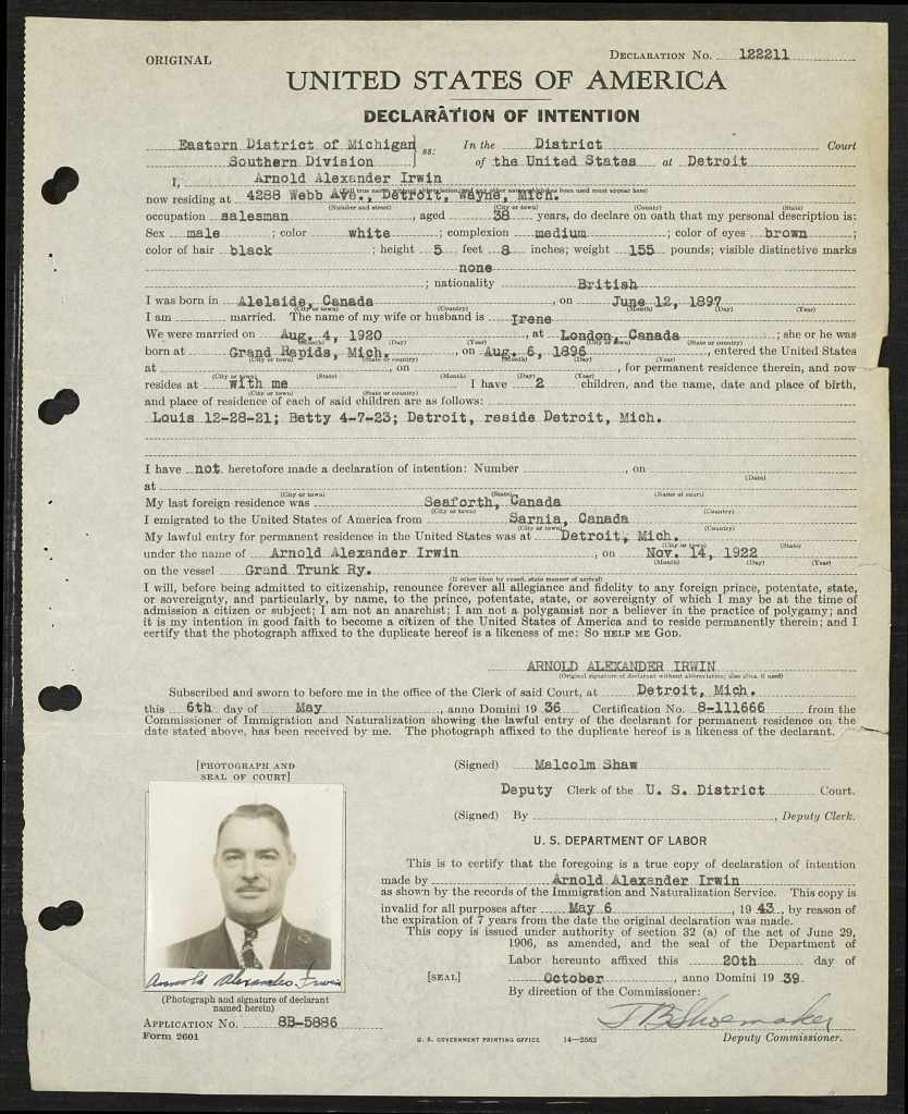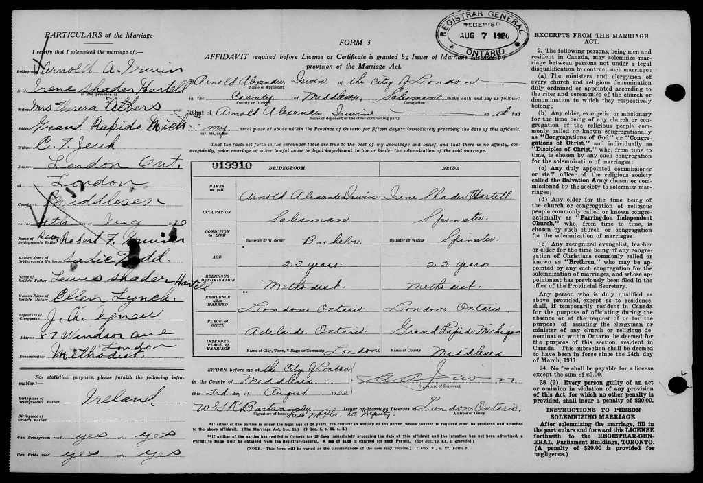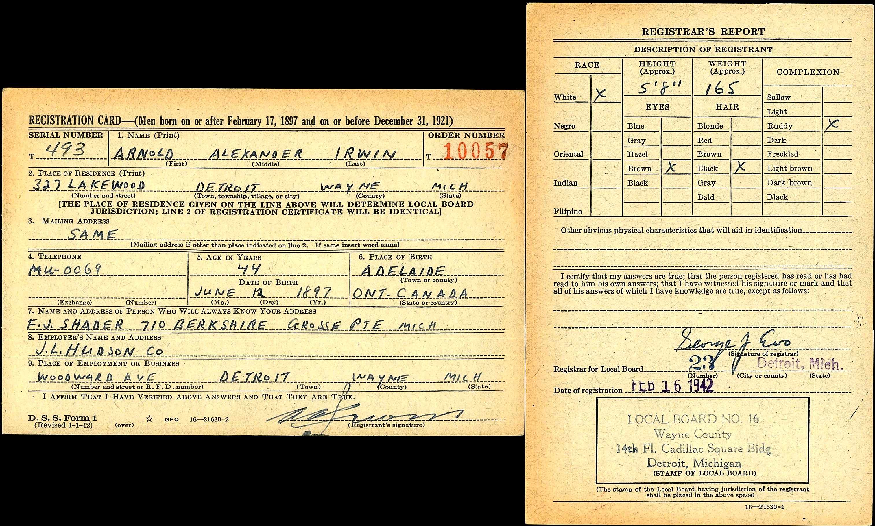 Family Search: When Private Arnold Alexander Irwin was born on 12 June 1897, in Arkona, Lambton, Ontario, Canada, his father, Robert Fulton Irwin, was 27 and his mother, Sarah Elizabeth Todd, was 30. He married Irene Shader Hartell on 3 August 1920, in London, Ontario, Canada. They were the parents of at least 1 son and 1 daughter. He immigrated to Detroit, Wayne, Michigan, United States in 1922 and lived in Toledo, Lucas, Ohio, United States in 1930 and Detroit Ward 21, Detroit, Wayne, Michigan, United States in 1940. He registered for military service in 1915. In 1915, at the age of 18, his occupation is listed as bank clerk in Wheatley, Kent, Ontario, Canada. He died on 14 September 1979, in Santa Clara, California, United States, at the age of 82, and was buried in Colma, San Mateo, California, United States.