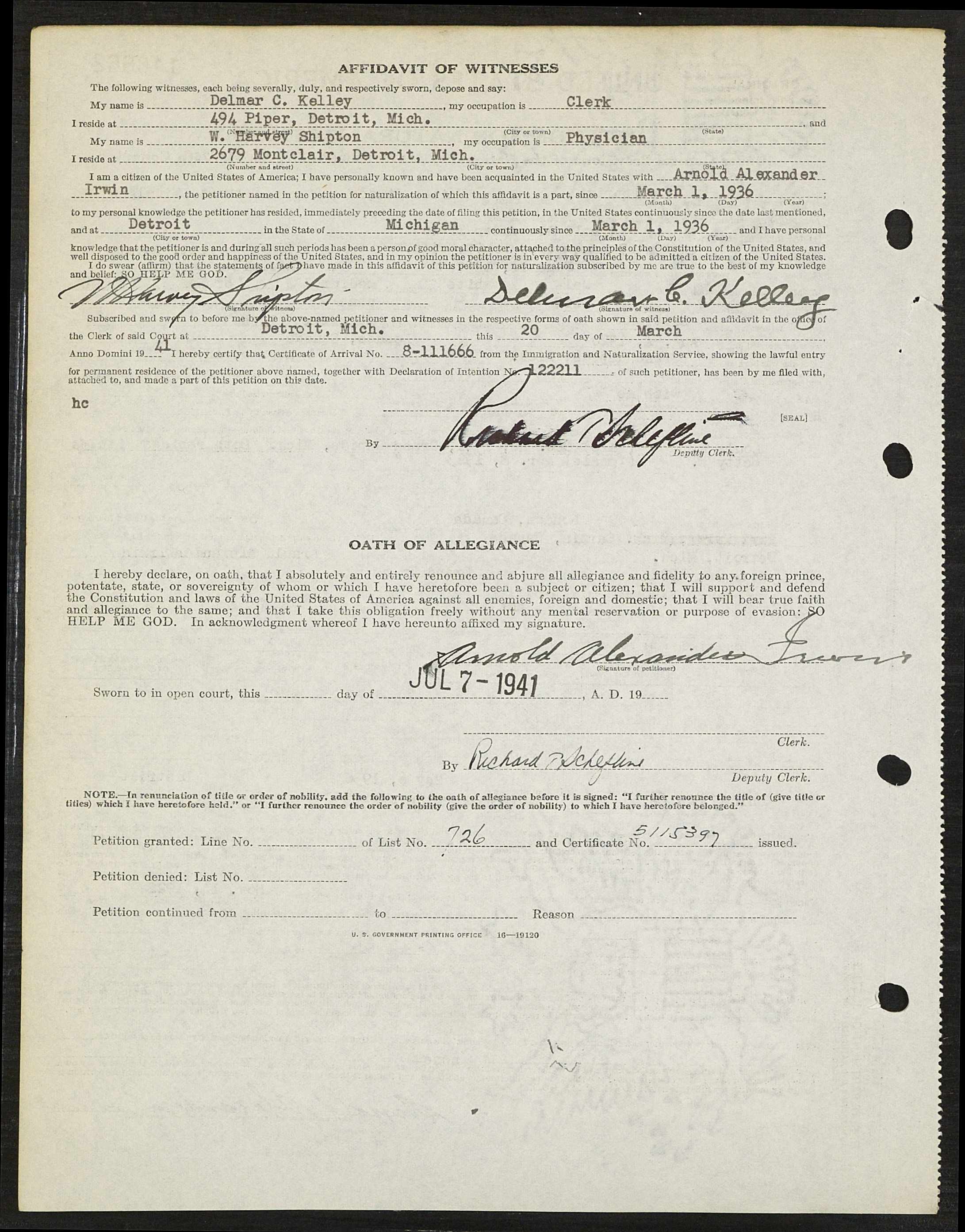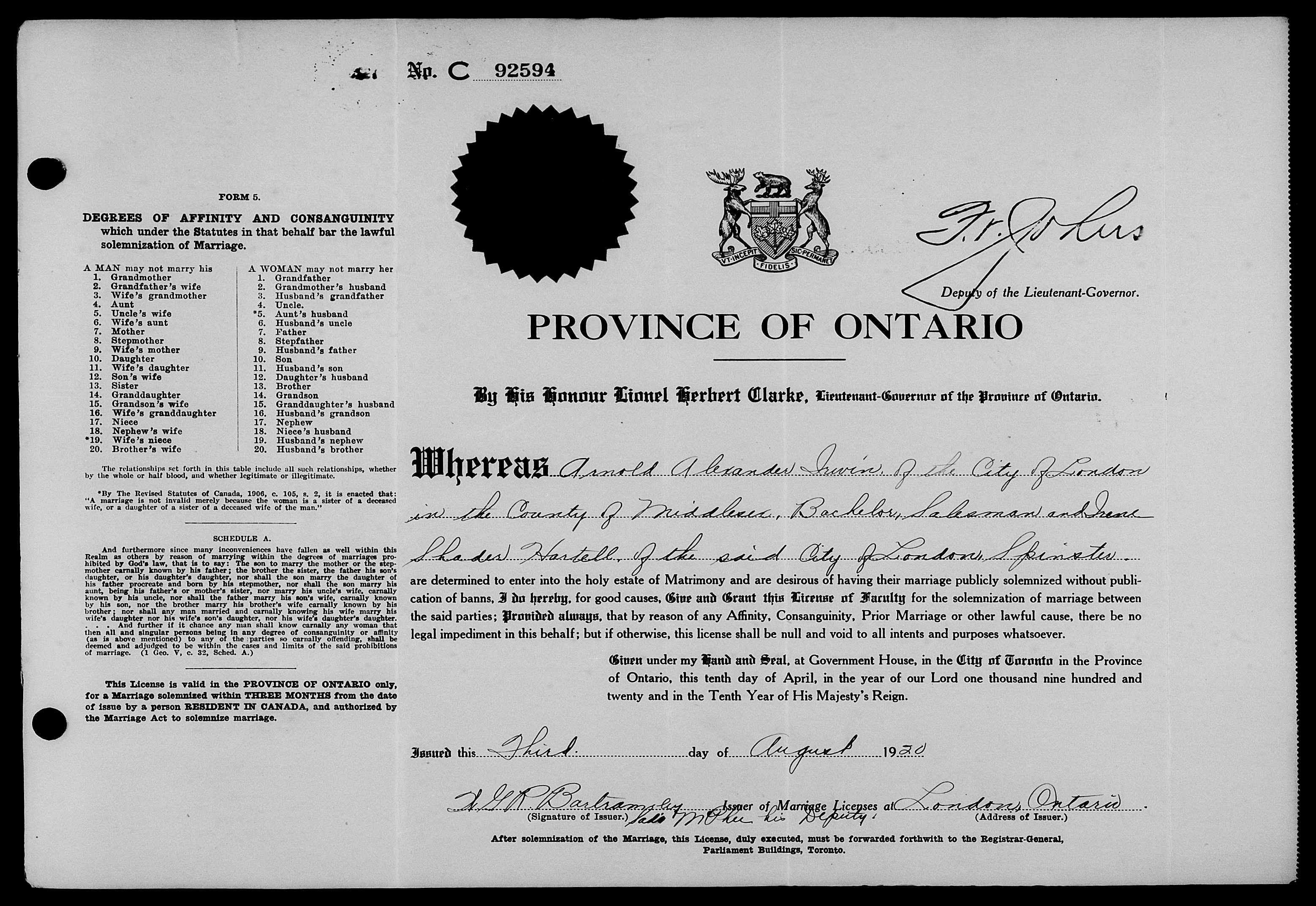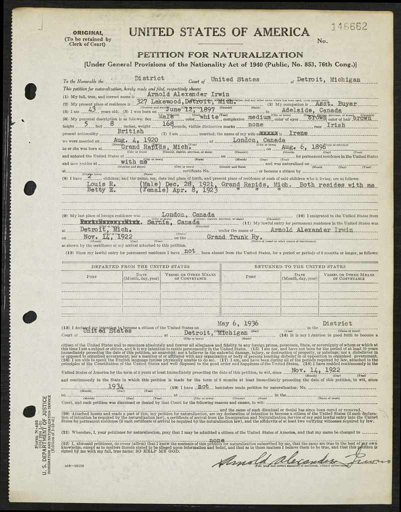 Family Search: When Private Arnold Alexander Irwin was born on 12 June 1897, in Arkona, Lambton, Ontario, Canada, his father, Robert Fulton Irwin, was 27 and his mother, Sarah Elizabeth Todd, was 30. He married Irene Shader Hartell on 3 August 1920, in London, Ontario, Canada. They were the parents of at least 1 son and 1 daughter. He immigrated to Detroit, Wayne, Michigan, United States in 1922 and lived in Toledo, Lucas, Ohio, United States in 1930 and Detroit Ward 21, Detroit, Wayne, Michigan, United States in 1940. He registered for military service in 1915. In 1915, at the age of 18, his occupation is listed as bank clerk in Wheatley, Kent, Ontario, Canada. He died on 14 September 1979, in Santa Clara, California, United States, at the age of 82, and was buried in Colma, San Mateo, California, United States.
