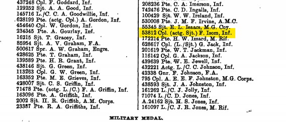 With great coolness and excellent judgement Sgt. ISOM, selected an alternative position and carried on and completed the work with great vigor. By his utter disregard for Danger and great coolness and gallantry with this N.C.O. ensured the success of this work which was of primary importance.