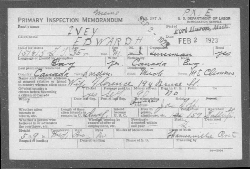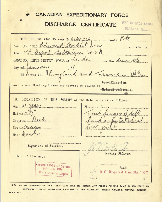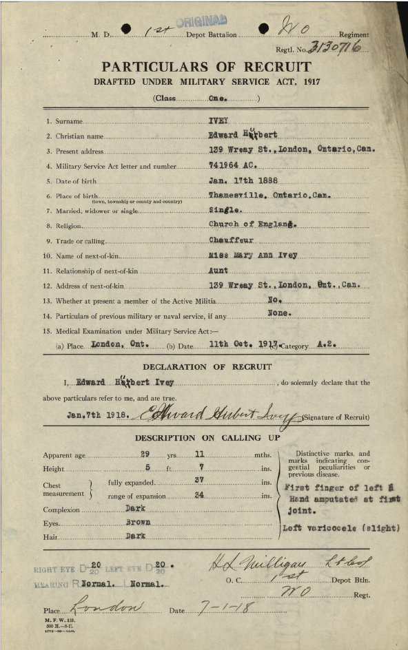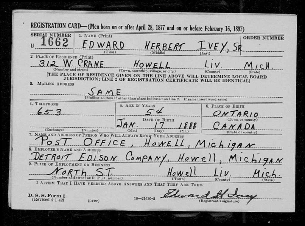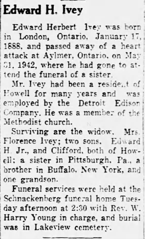 Family Search: When Private Edward Herbert Ivey Sr. was born on 17 January 1888, in Thamesville, Kent, Ontario, Canada, his father, Richard Ivey Sr, was 29 and his mother, Elizabeth Ann Clifford, was 25. He married Florence Isabella Hassard on 30 December 1919, in London, Ontario, Canada. They were the parents of at least 2 sons. He immigrated to Port Huron, St. Clair, Michigan, United States in 1923 and lived in Howell Township, Livingston, Michigan, United States in 1930 and Howell, Livingston, Michigan, United States for about 2 years. He registered for military service in 1918. In 1918, at the age of 30, his occupation is listed as chauffeur in London, Ontario, Canada. He died on 31 May 1942, in Aylmer, Elgin, Ontario, Canada, at the age of 54, and was buried in Lake View Cemetery, Howell, Livingston, Michigan, United States.
