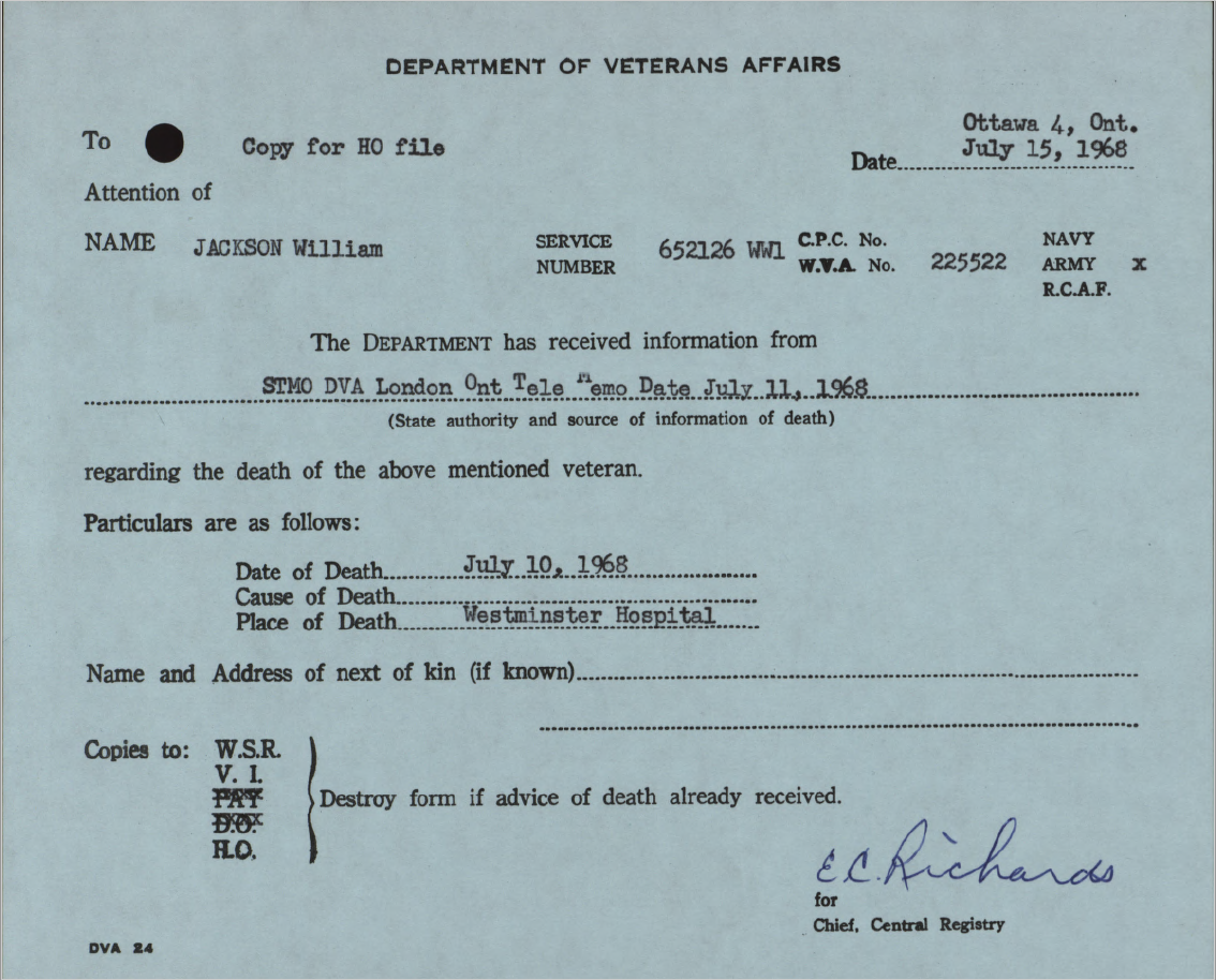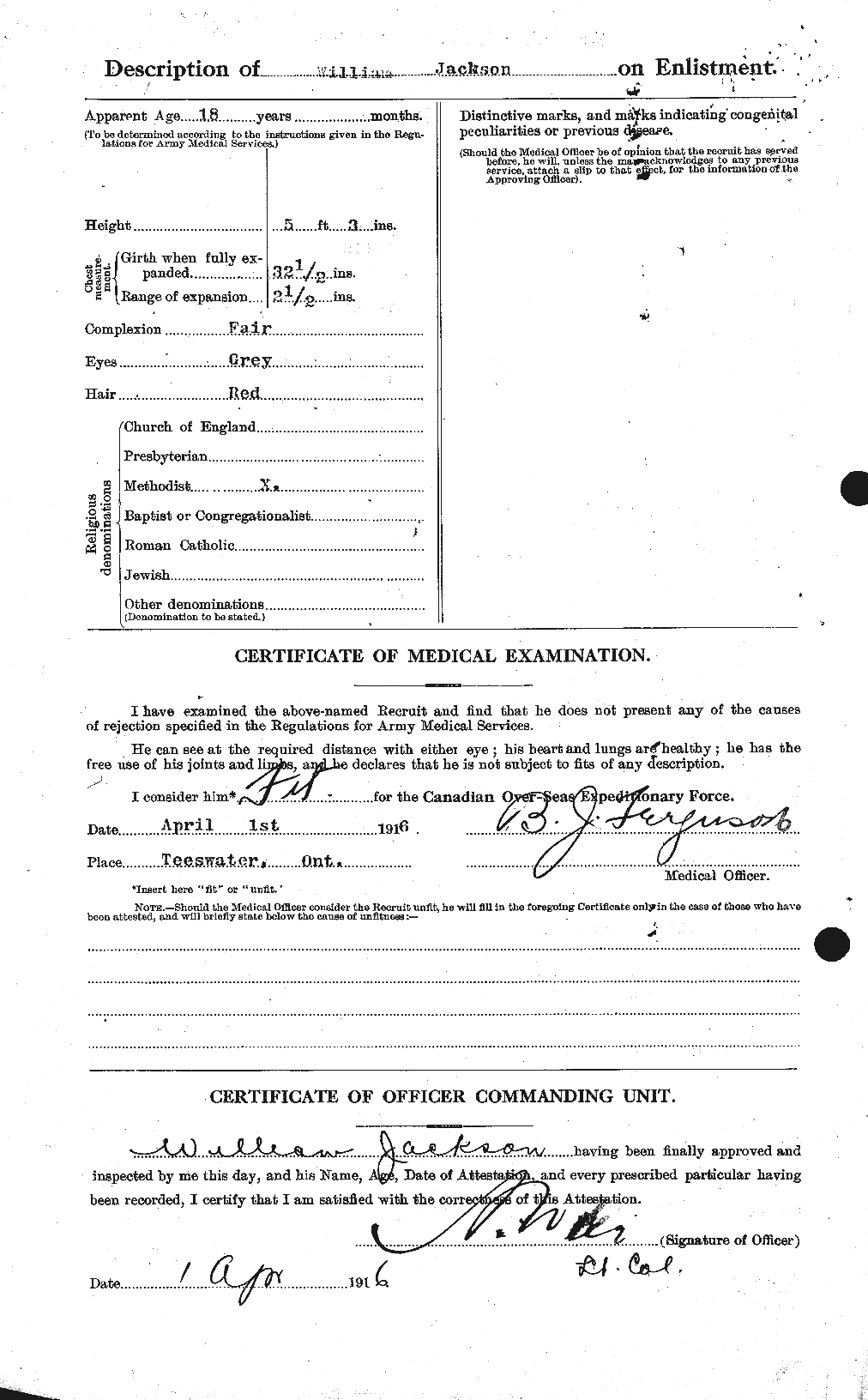 Family Search: Private William Jackson was born on 1 May 1899, in Gloucestershire, England, United Kingdom. He married Elsie Ethel Tanner on 22 December 1921, in Teeswater, Bruce, Ontario, Canada. He immigrated to Canada in 1915. He registered for military service in 1916. In 1916, at the age of 17, his occupation is listed as farm labourer in Teeswater, Bruce, Ontario, Canada. He died on 10 July 1968, in London, Ontario, Canada, at the age of 69