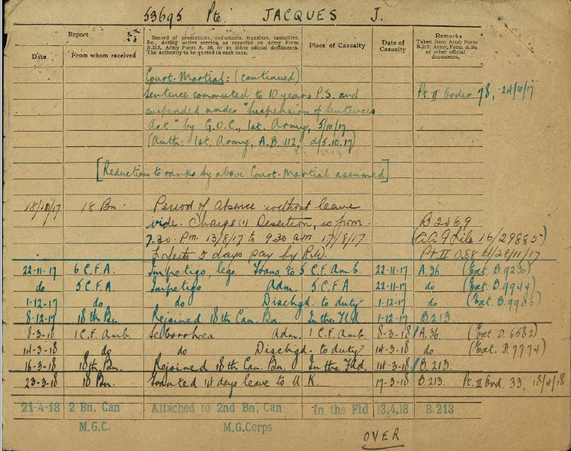 Charged twice. One charge was under section 9 (disobeying lawful orders from a superior officer) and 12 (deserting or encouraging others to desert) which led to is conviction. He was convicted on September 25, 1917 and the sentence was modified to 10 years penal servitude and subsequently suspended February 2, 1919. The second charge was under section 19 (drunkenness).