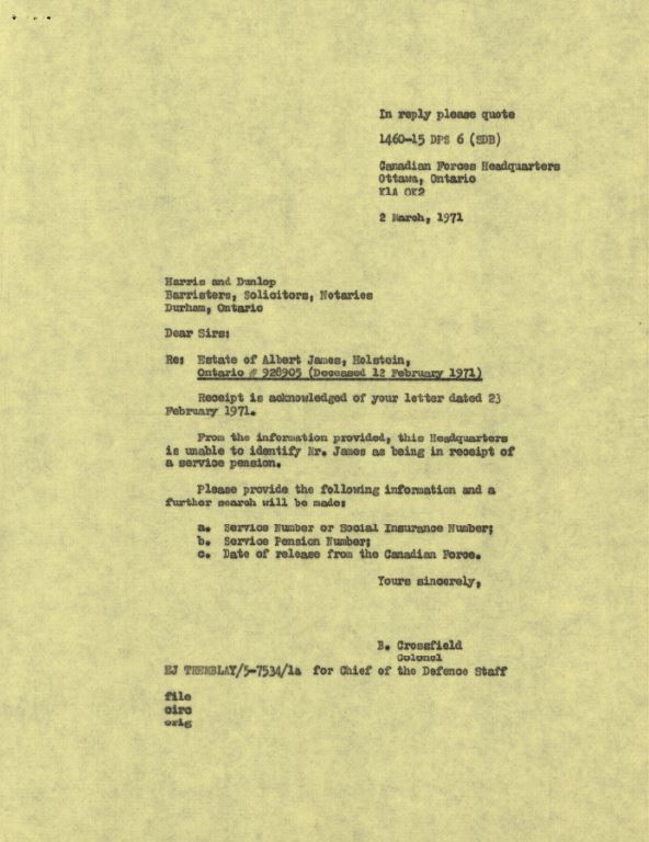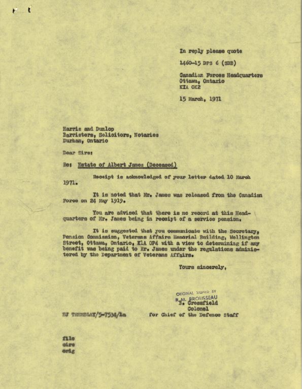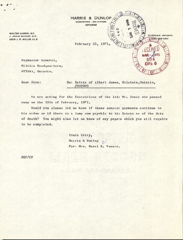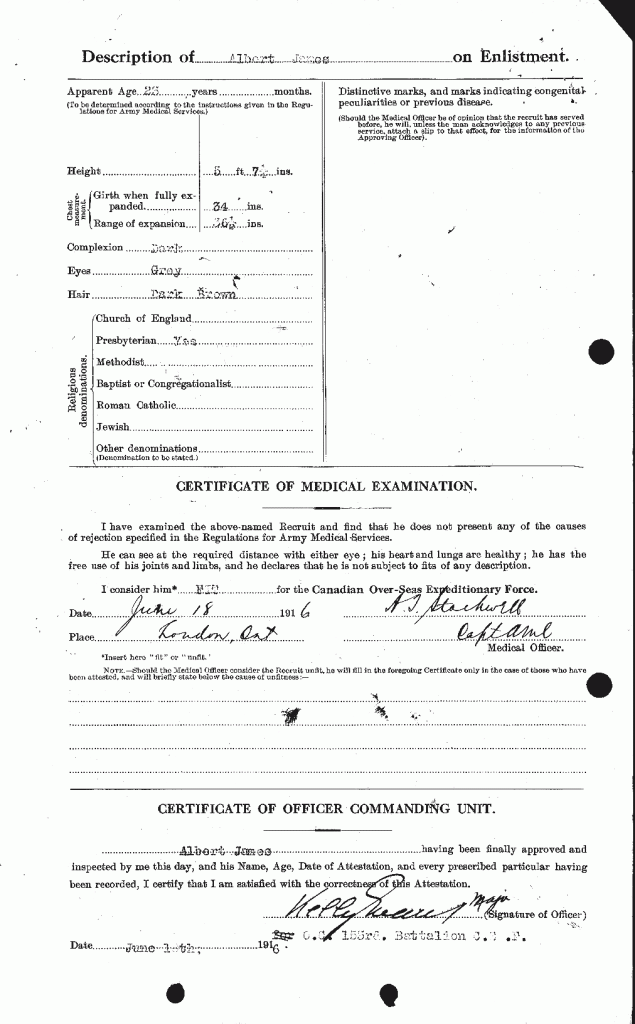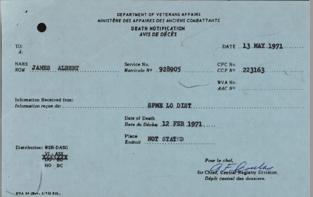 Family Search: Albert James was born on 19 June 1893, in Birmingham, West Midlands, England, United Kingdom as the son of George James and Sarah Retchford. He lived in Mount Forest, Wellington North, Wellington, Ontario, Canada in 1916 and Holstein, Southgate, Grey, Ontario, Canada for about 48 years. He registered for military service in 1916. In 1916, at the age of 23, his occupation is listed as motorcycle mechanic. He died on 12 February 1971, at the age of 77, and was buried in Mount Forest Cemetery, Southgate, Grey, Ontario, Canada.