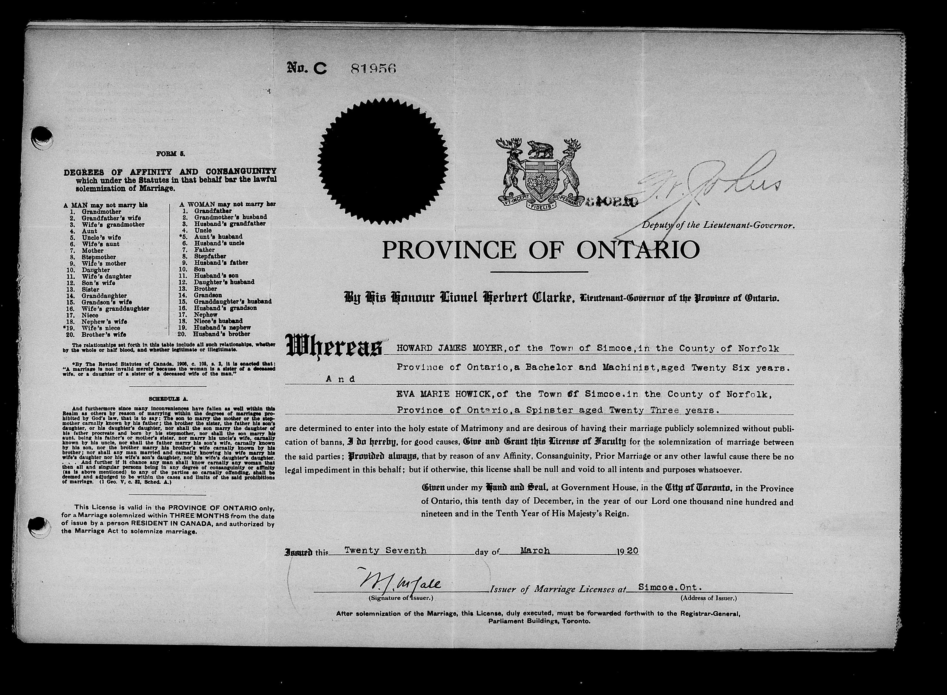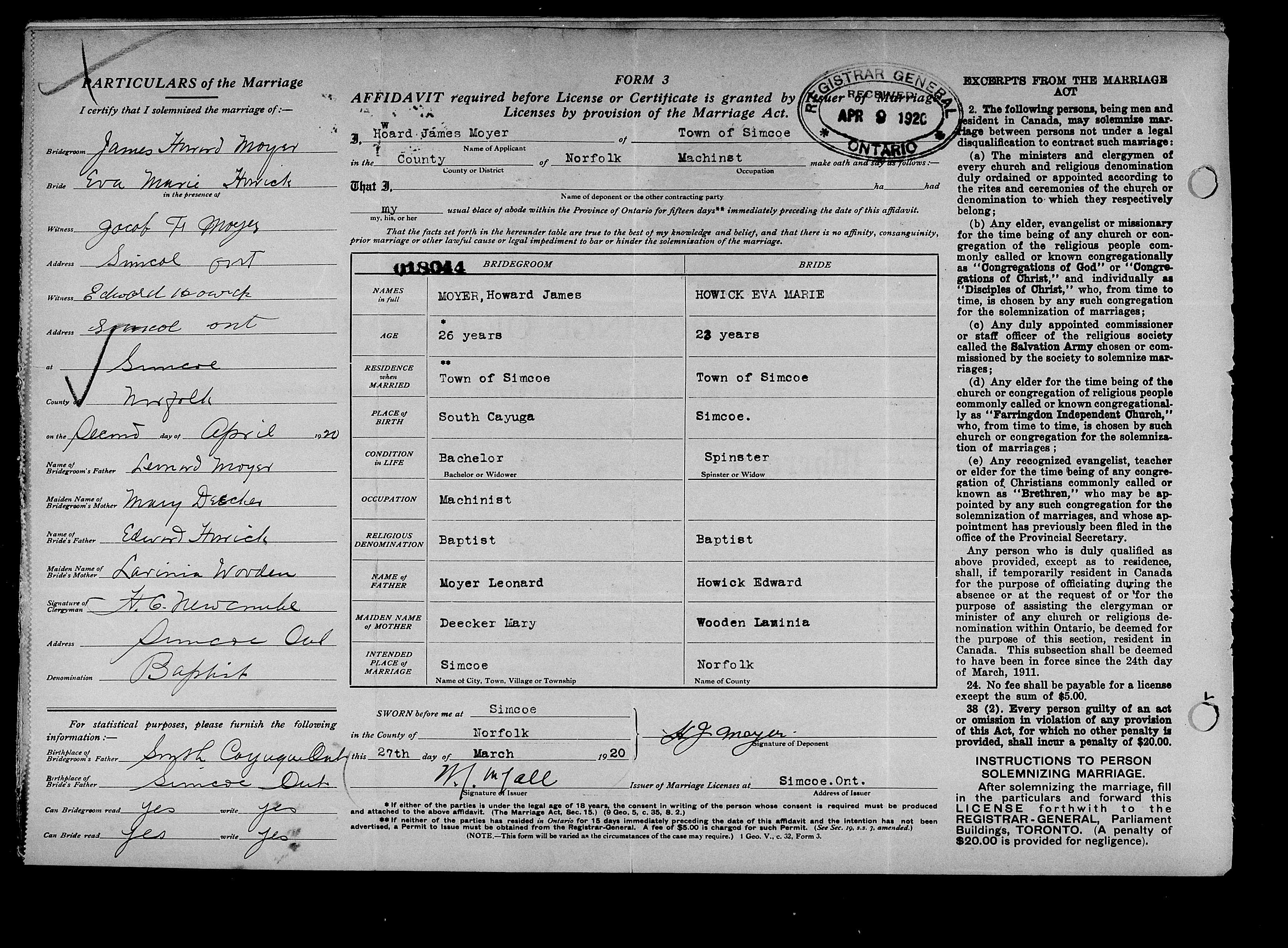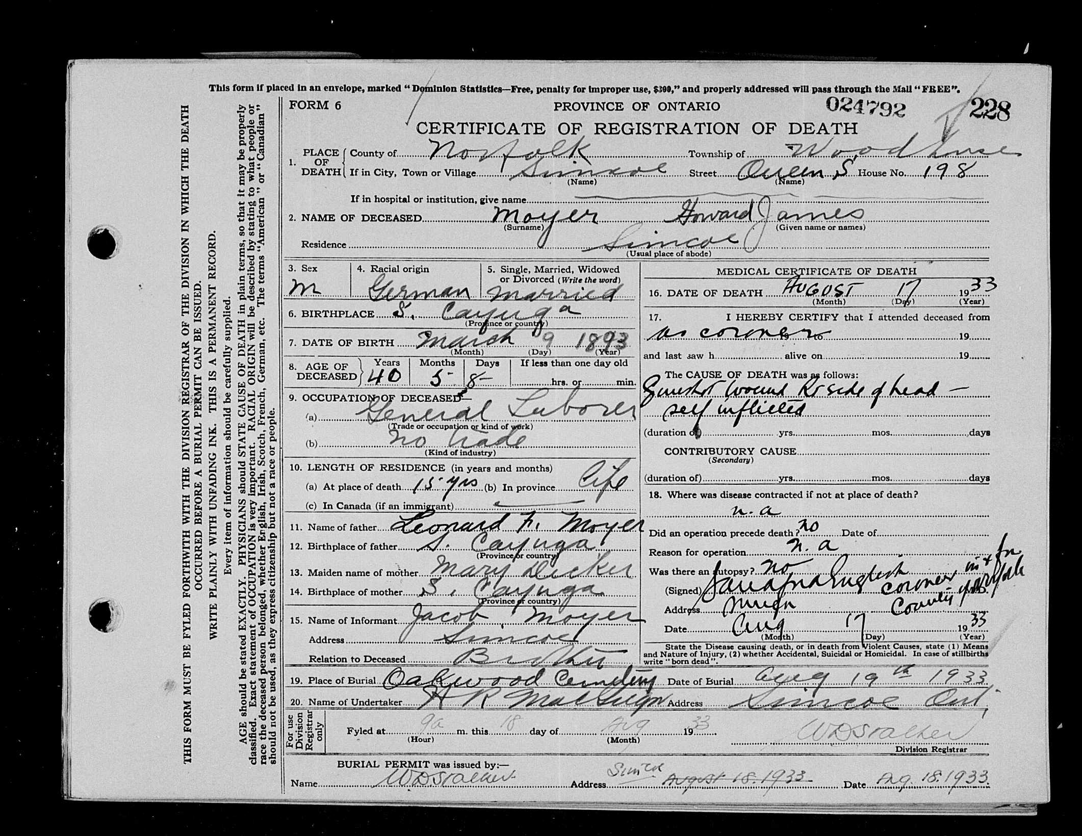 Family Search: When Howard James Moyer was born on 19 March 1895, in South Cayuga, Haldimand, Ontario, Canada, his father, Leonard F. Moyer, was 38 and his mother, Mary Catherine Decker, was 28. He married Eva Marie Howick on 27 March 1920, in Simcoe, Ontario, Canada. He lived in Ontario, Canada in 1895 and Haldimand, Ontario, Canada in 1901. He died on 17 August 1933, in Simcoe, Ontario, Canada, at the age of 38, and was buried in Oakwood Cemetery, Simcoe, Norfolk, Ontario, Canad