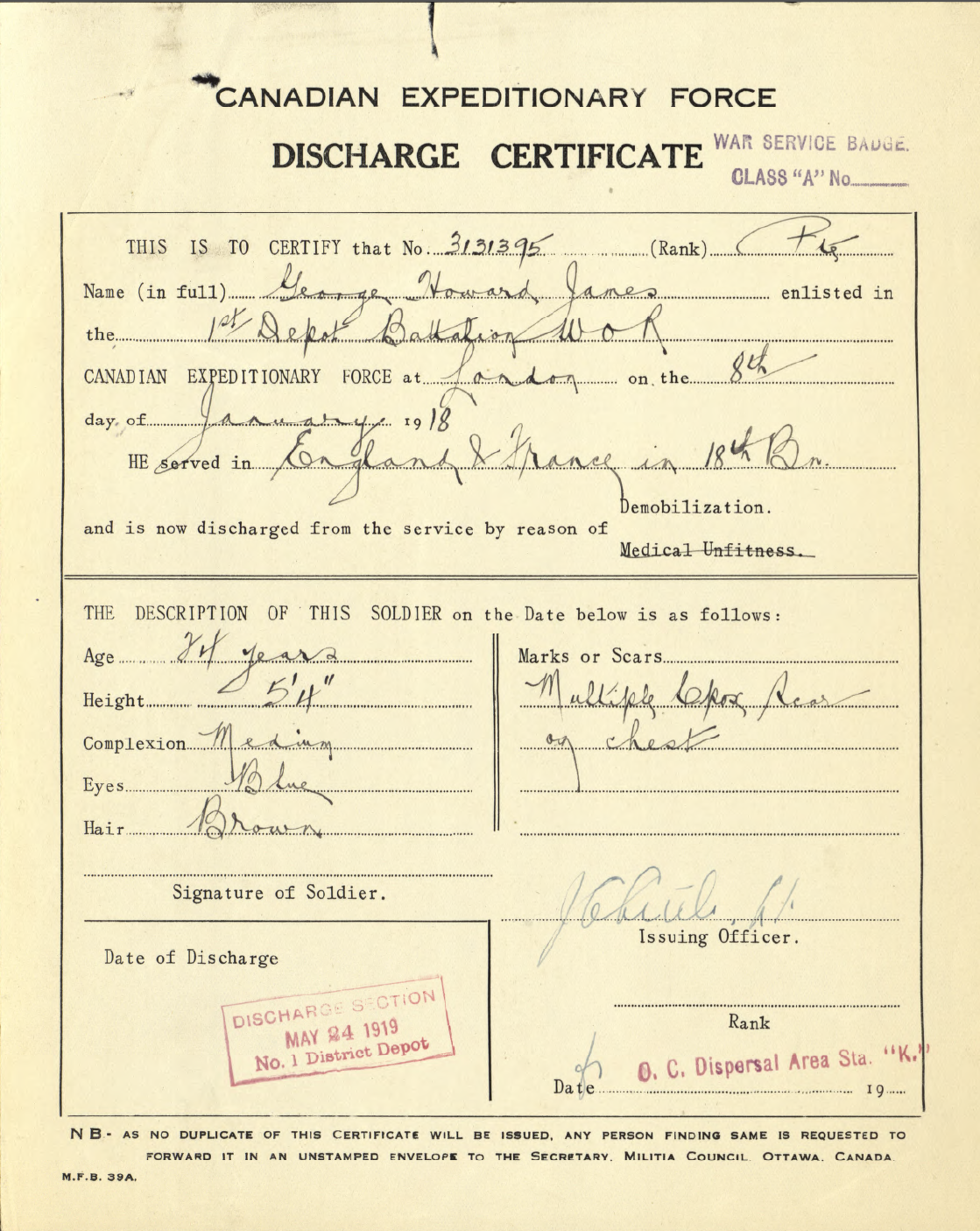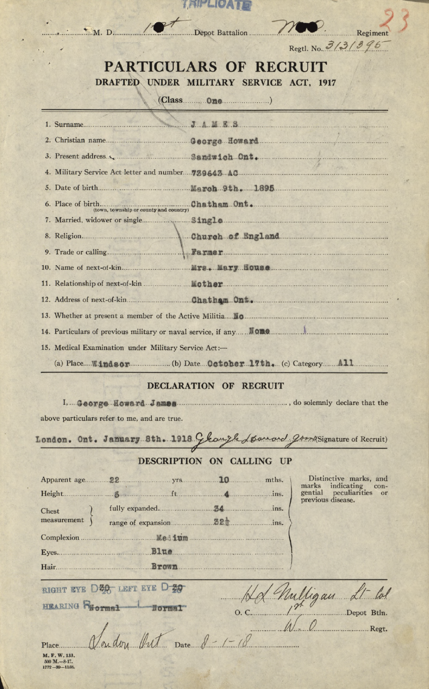 He reported for military service under the MSA (1917) at London, Ontario on 8 January 1918 under the name of George Howard James.