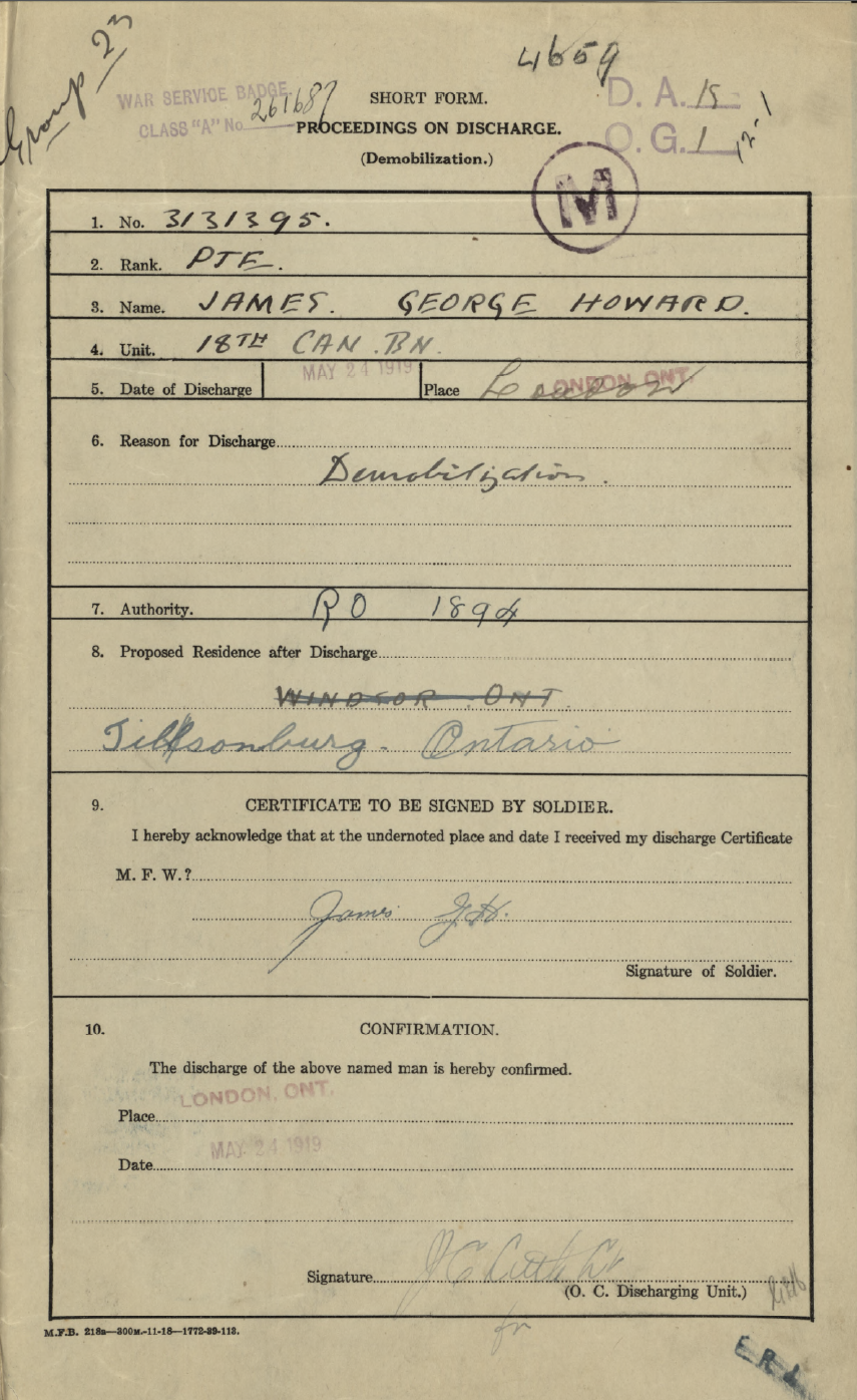 Family Search: Private George Howard James was born on 9 March 1894/5, in South Cayuga, Haldimand, Ontario, Canada as the son of George Howard and Mary. He lived in Sandwich, Essex, Ontario, Canada in 1918 and Tillsonburg, Oxford, Ontario, Canada in 1919. He registered for military service in 1918. In 1918, at the age of 23, his occupation is listed as farmer in Sandwich, Essex, Ontario, Canada.