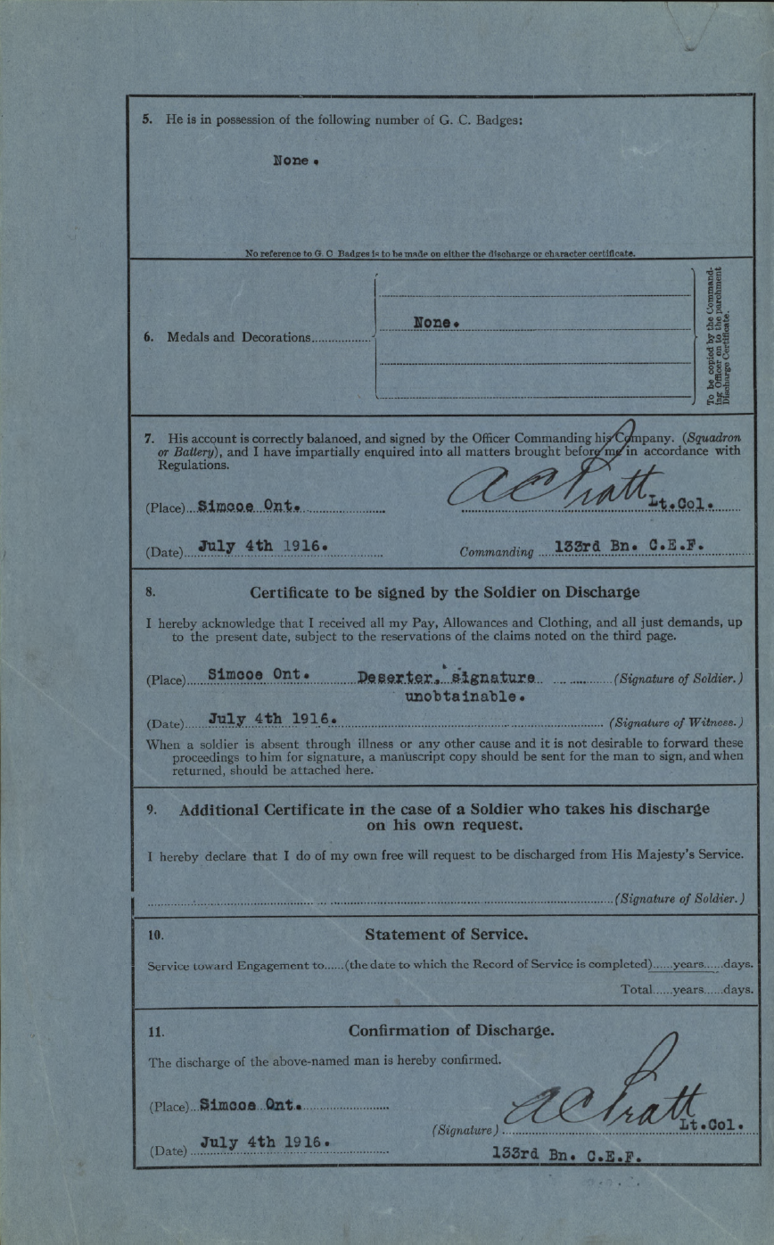 This man first enlisted under the name of Howard James Moyer at Simcoe, Ontario on 17 March 1916 and was declared a deserter on 4 July 1916.