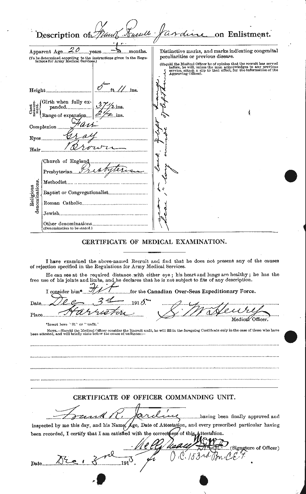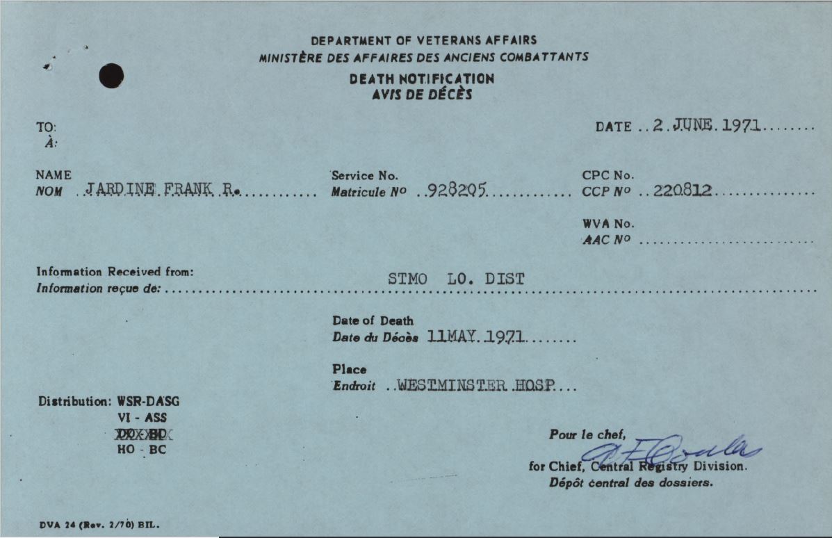 “Trade listed as Student. DOB 7-7-95, born Harriston. 5 foot 11 inches. Grey eyes, brown hair. Presbyterian. NOK Mary Russell, mother. David Ferguson Jardine, father. Enlisted Harriston 3-12-15 (age 20 years 5 months), lists 3 years service in 30th Wellington Regiment. On 153rd Battalion Nominal Roll 12-2-16, no transfers noted. On 153rd Nominal Rolls as published Guelph Mercury 10-6-16 and 1-12-16. Embarked with 153rd Halifax N.S. SS Olympic 29-4-17. Arrived Liverpool 7-5-17. Assigned 25th Reserve for Training and Administration. Taken on Strength 18th Battalion 29-3-18. Hospitalized sick influenza 19-9-18. Invalided to England 6-10-18. Returned to Canada aboard SS Baltic, Halifax, N.S. 5-2-19. Demobilized London 1-3-19, forwarding address Toronto. Ontario Marriage Registry (003422) married 16-6-23 to Annie Louise Hutcheson at Toronto. DVA Notice of Death: died 11-5-71, Westminister Hospital, London.