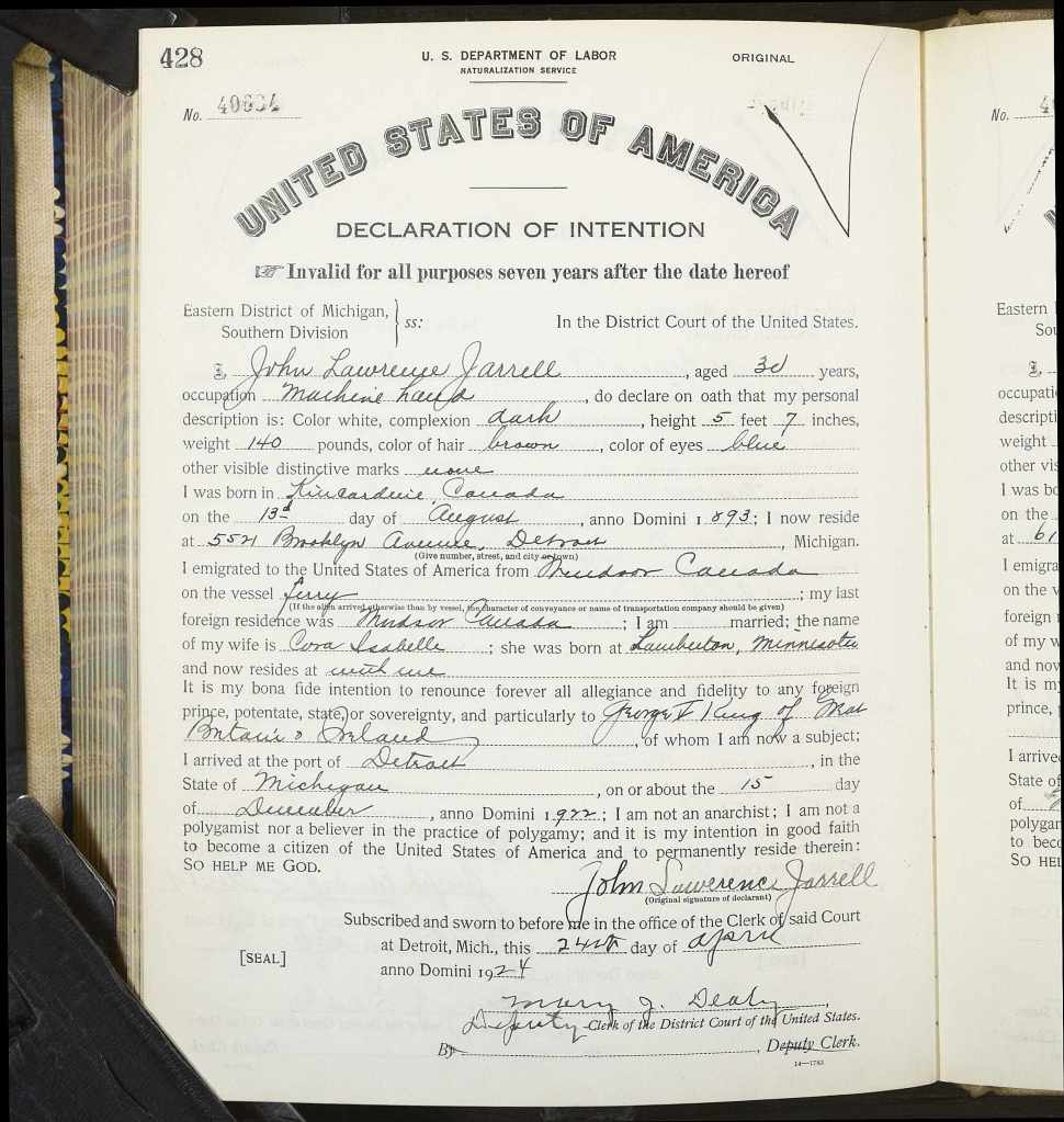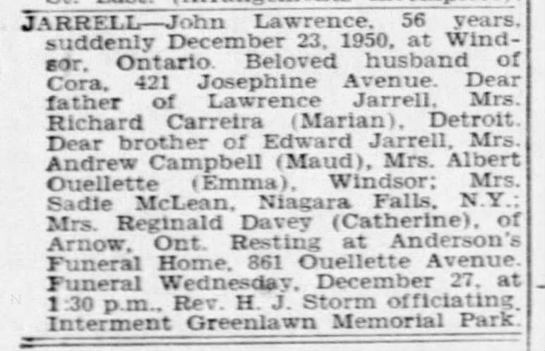 Family Search: When Private John Lawrence Jarrell was born on 13 August 1893, in Kincardine, Bruce, Ontario, Canada, his father, Elliott Jarrel, was 30 and his mother, Dolina Morrison, was 22. He had at least 1 son and 2 daughters with Cora Isabelle Myhr. He immigrated to Halifax, Nova Scotia, Canada in 1919 and lived in Bruce, Ontario, Canada for about 10 years. He registered for military service in 1916. In 1916, at the age of 23, his occupation is listed as farmer. He died on 23 December 1950, in Windsor, Essex, Ontario, Canada, at the age of 57, and was buried in Greenlawn Memorial Gardens, Oldcastle, Tecumseh, Essex, Ontario, Canada.