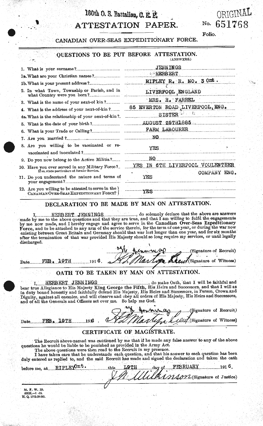 This man enlisted with the 160th Overseas Battalion on 19 February 1916 at Ripley, Ontario. He was a farm labourer and embarked for the United Kingdom on 18 October 1916 (Halifax) and arrived at Liverpool on 28 October 1916.