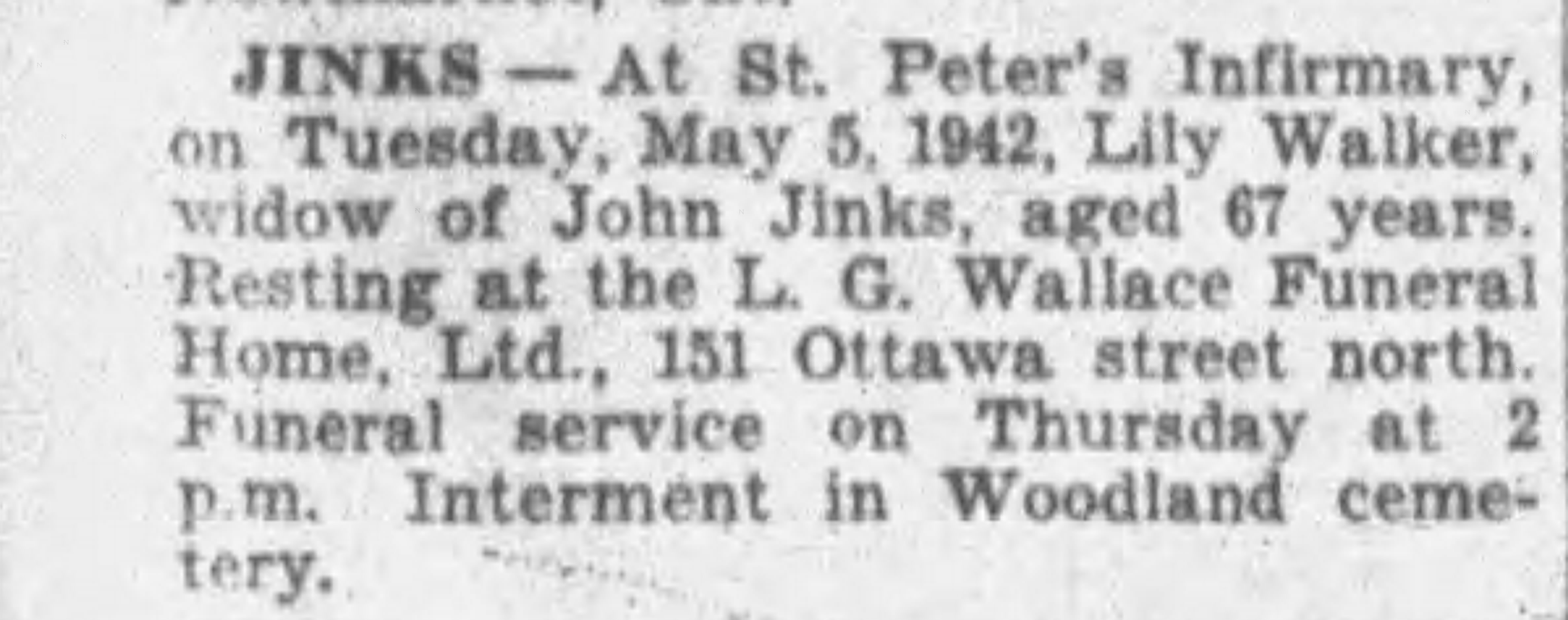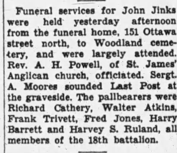 Funeral service for John Jinks were held yesterday afternoon from the funeral home, 151 Ottawa street north, to Woodland cemetery, ans were largely attended. Rev. A. H. Powell of St. James’ Anglican church officiated. Sergt. A. Moores sounded Last Post at the grave side. The pallbearers were Richard Cathery, Walter Atkins, Frank Trivett, Fred Jones, Harry Barrett and Harvey S. Ruland, all members of the 18th battalion.