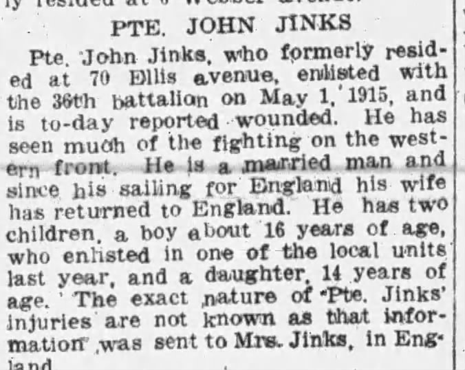 Family Search: When Private John Jinks was born on 13 November 1876, in Woolwich, Kent, England, United Kingdom, his father, Josiah Jinks, was 37 and his mother, Eliza Petty, was 33. He married Lilly Walker on 26 December 1898, in Carbrook, Yorkshire, England, United Kingdom. They were the parents of at least 1 son and 1 daughter. He immigrated to St. John, New Brunswick, Canada in 1906 and lived in Halton, Ontario, Canada in 1911 and Hamilton, Hamilton-Wentworth, Ontario, Canada in 1915. He registered for military service in 1915. In 1915, at the age of 39, his occupation is listed as labourer in Hamilton, Hamilton-Wentworth, Ontario, Canada. He died on 7 February 1937, in Bartonville, Hamilton, Hamilton-Wentworth, Ontario, Canada, at the age of 60, and was buried in Woodland Cemetery, Hamilton, Ontario, Canada.