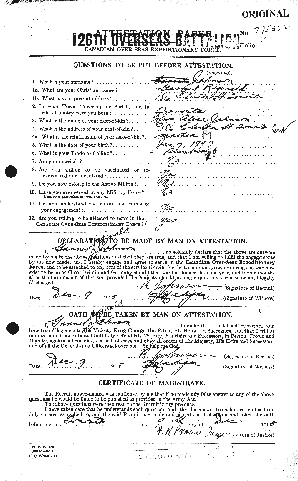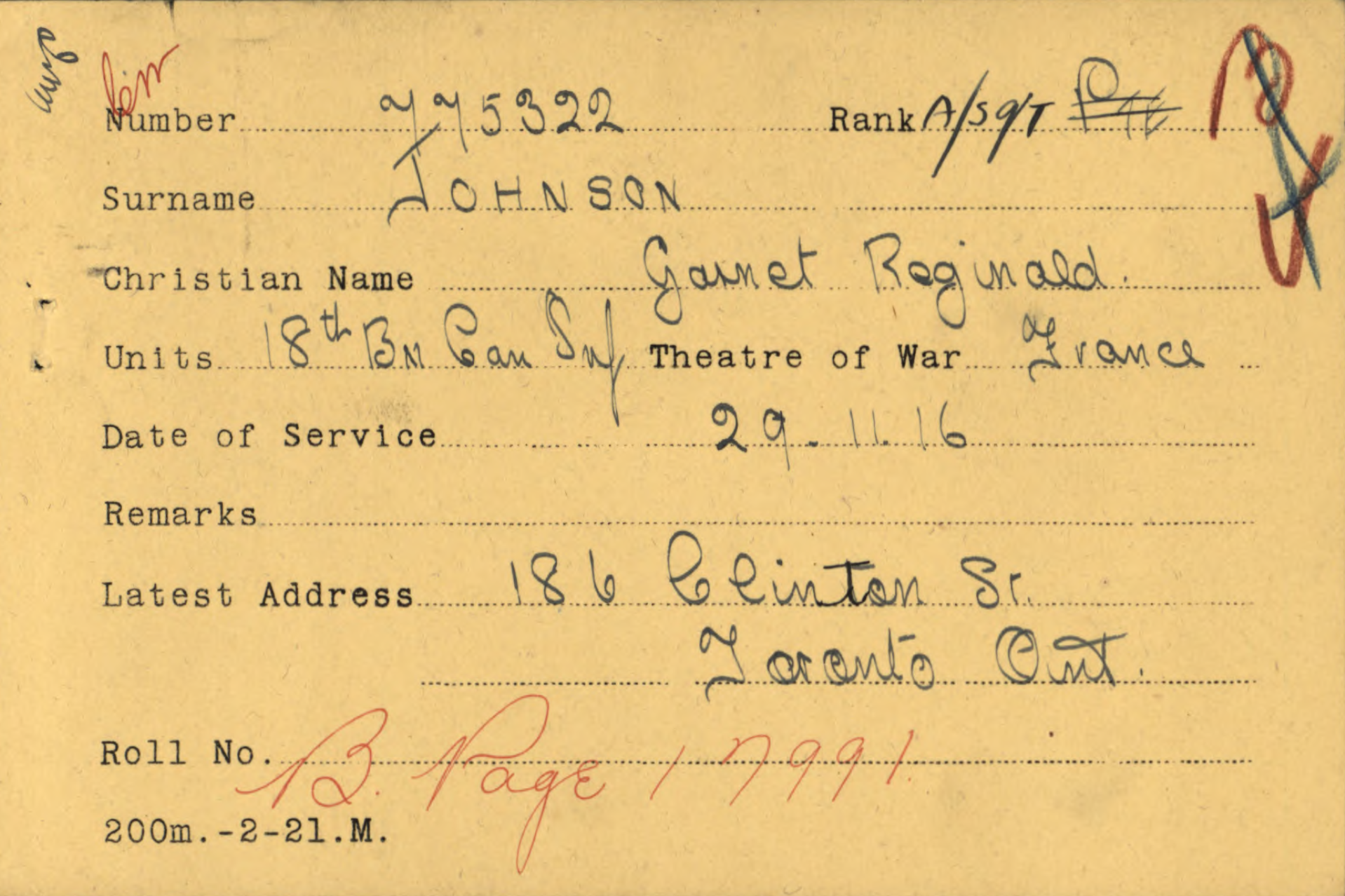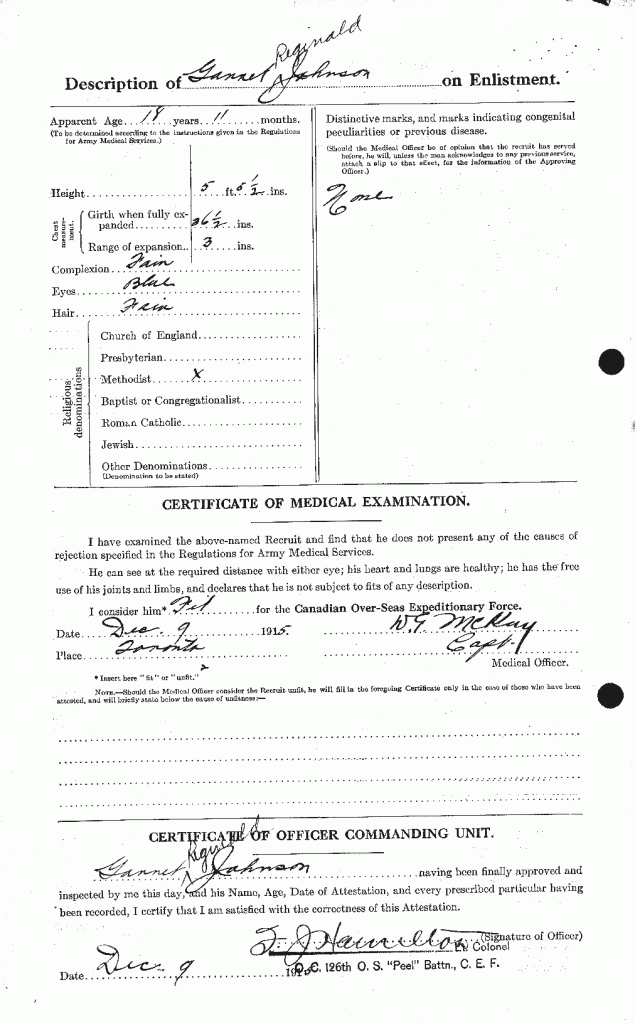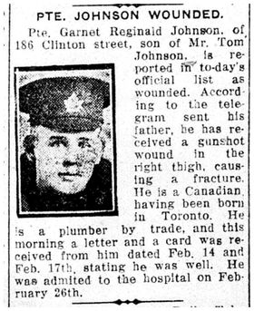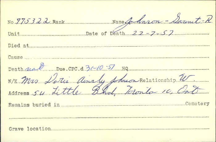 Family Search: When Private Garnet Reginald Johnson was born on 7 January 1897, in Toronto, York, Ontario, Canada, his father, Thomas Johnson, was 34 and his mother, Alice Roberts, was 36. He registered for military service in 1915. In 1915, at the age of 18, his occupation is listed as plumber in Toronto, York, Ontario, Canada. He died on 22 July 1957, in Toronto, Ontario, Canada, at the age of 60, and was buried in Prospect Cemetery, Toronto, Ontario, Canada.