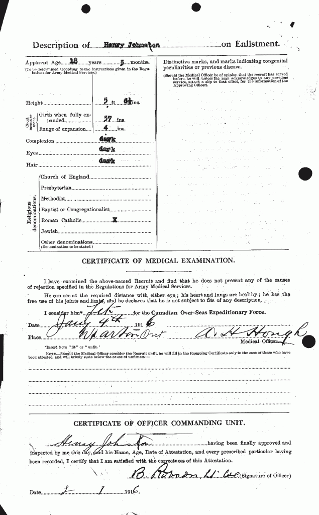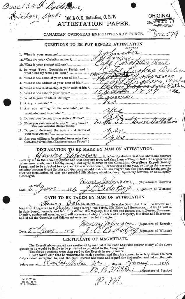Family Search: Private Henry Johnson was born on 15 October 1897, in Cape Croker, Neyaashiinigmiing, Bruce, Ontario, Canada as the son of Henry Johnson. He registered for military service in 1916. In 1916, at the age of 19, his occupation is listed as farmer in Cape Croker, Neyaashiinigmiing, Bruce, Ontario, Canada.
