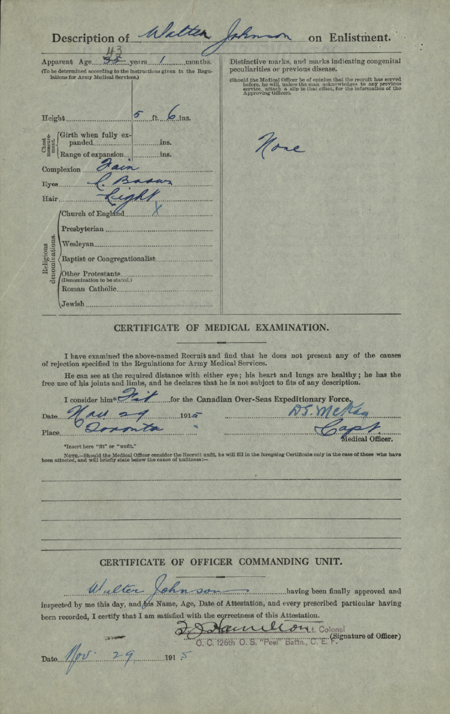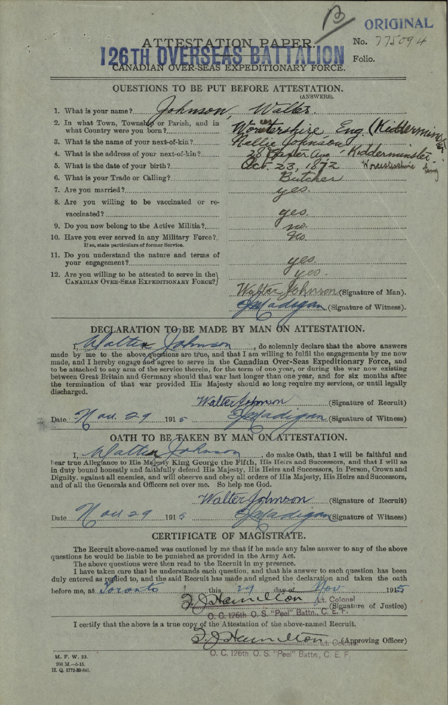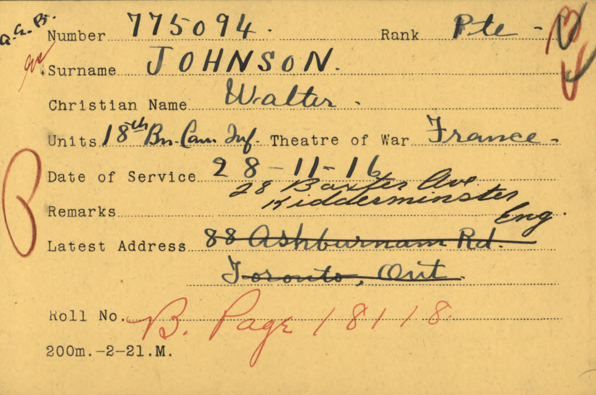 Family Search: Private Walter Robert Johnson was born on 23 October 1874, in Worcestershire, England, United Kingdom. He had at least 1 daughter with Ellen. He immigrated to Canada in 1913 and lived in Toronto, York, Ontario, Canada in 1920 and Kidderminster, Worcestershire, England, United Kingdom in 1923. He registered for military service in 1915. In 1915, at the age of 41, his occupation is listed as butcher in Toronto, York, Ontario, Canada.