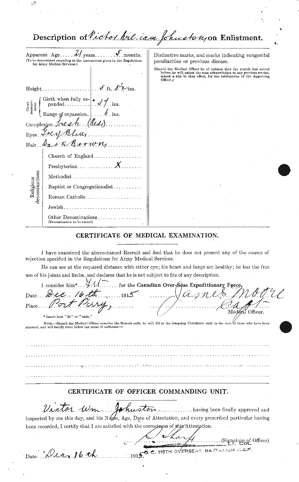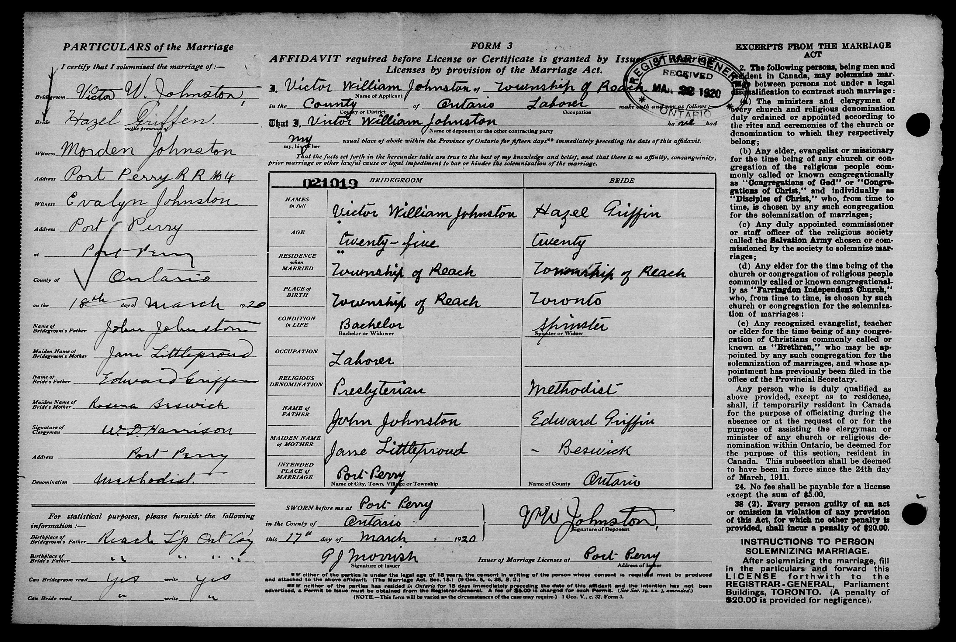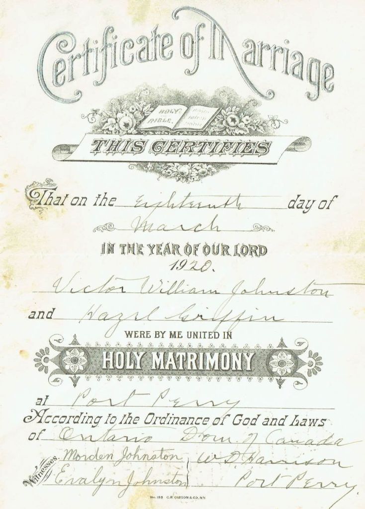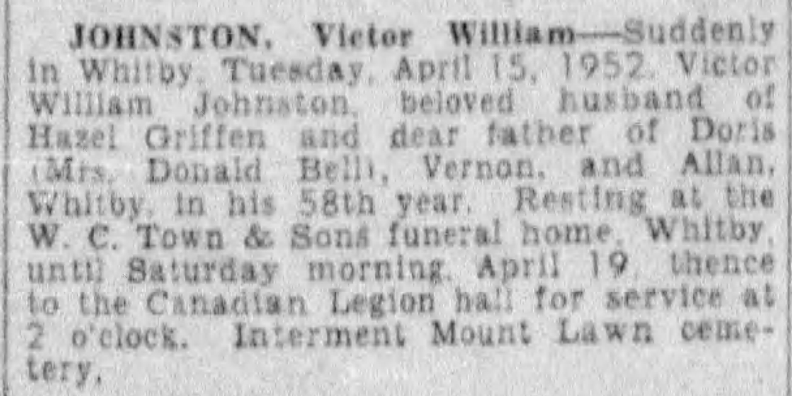 Family Search: When Private William Victor Douglas Johnston was born on 12 July 1894, in Utica, Ontario, Ontario, Canada, his father, John Johnston, was 27 and his mother, Phoebe Jane Sophia Littleproud, was 24. He married Hazel Griffen on 17 March 1920, in Port Perry, Durham, Ontario, Canada. They were the parents of at least 2 sons and 1 daughter. He lived in Port Perry, Ontario, Ontario, Canada in 1915 and Whitby, Ontario, Ontario, Canada in 1931. He registered for military service in 1915. In 1915, at the age of 21, his occupation is listed as farmer in Port Perry, Ontario, Ontario, Canada. He died on 15 April 1952, in Whitby Township, Ontario, Canada West, British North America, at the age of 57, and was buried in Mount Lawn Memorial Gardens, Whitby, Durham, Ontario, Canada.