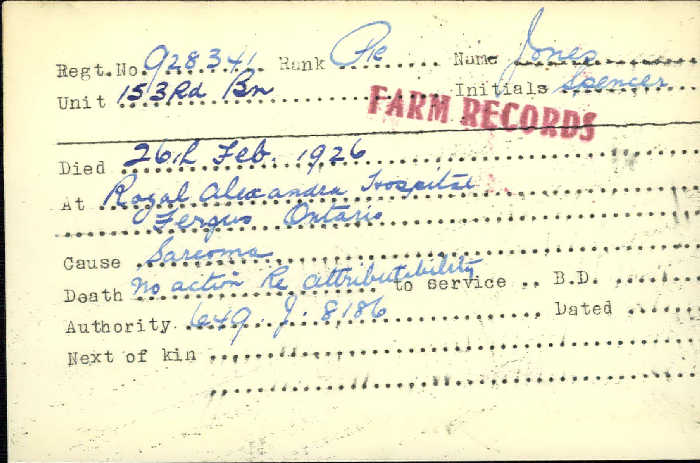 Ontario Death Records (035735) notes death 26-2-26, cause sarcoma buried Fergus. Veterans Death Card: not war service related. Under NOK no relations in this country. Buried Fergus.