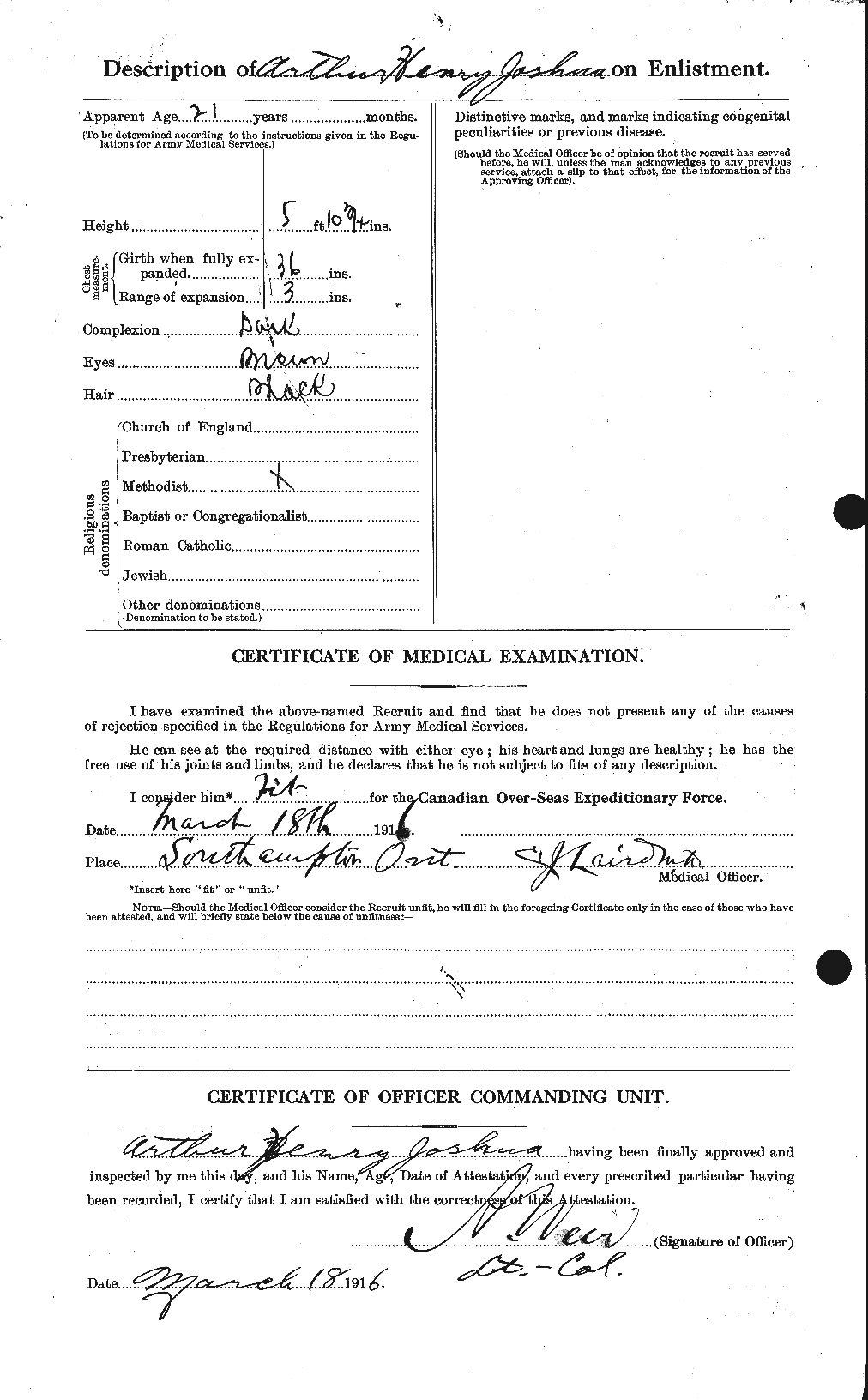 He was single and listed his father Mr. Edward Joshua of Chippawa Hill, Ontario, as his next-of-kin. He had no prior military experience.