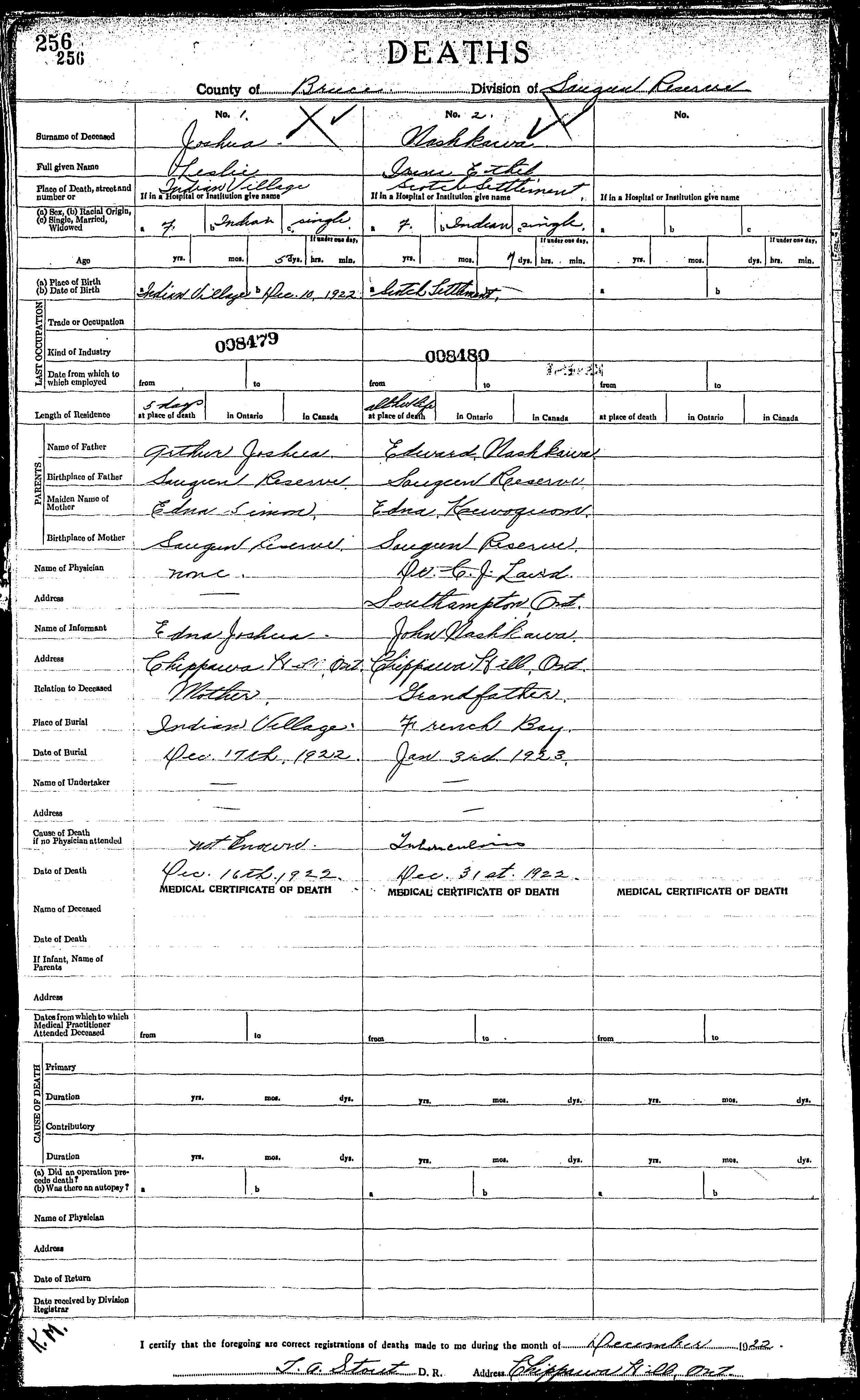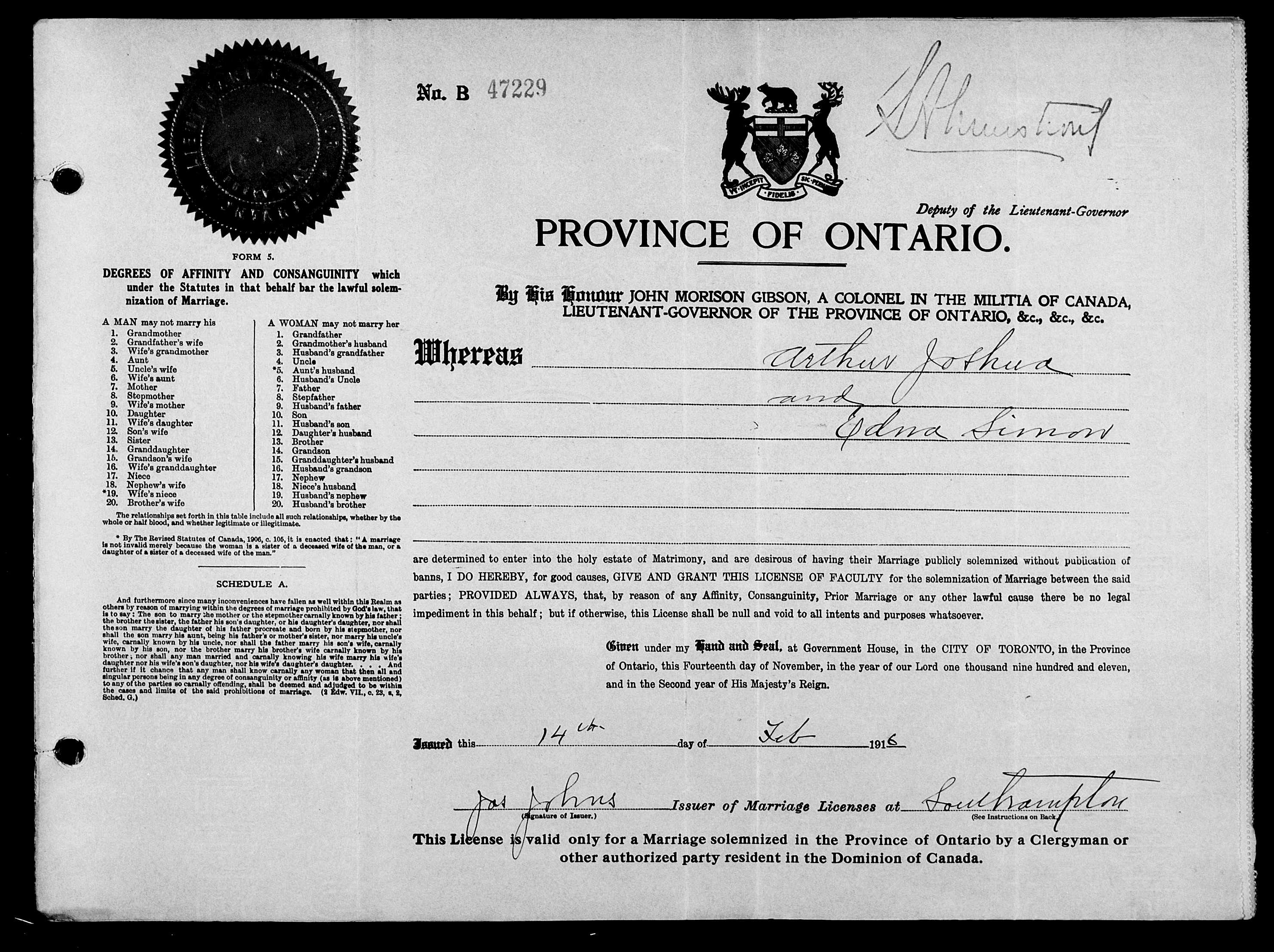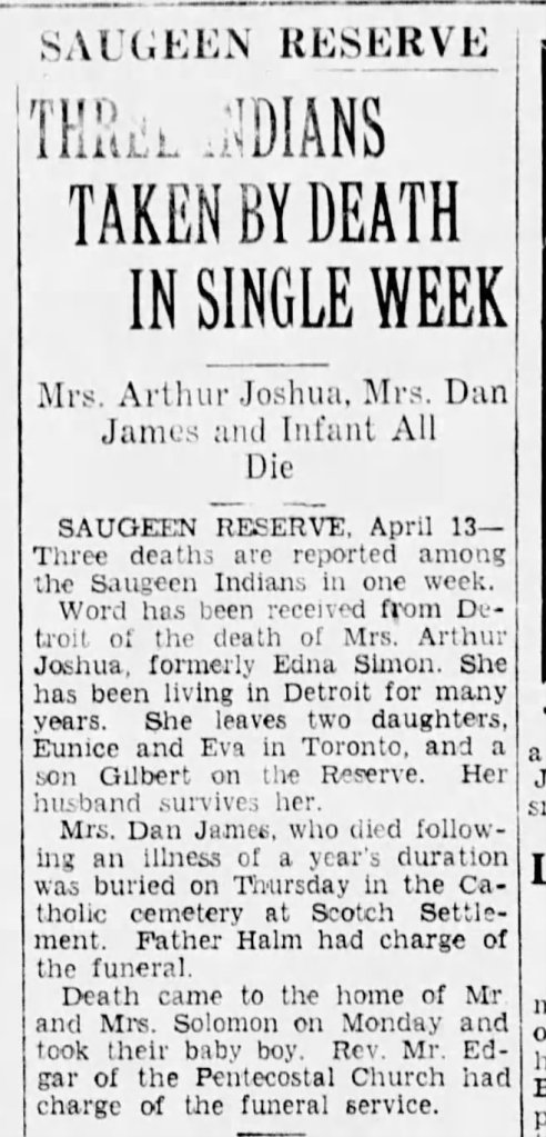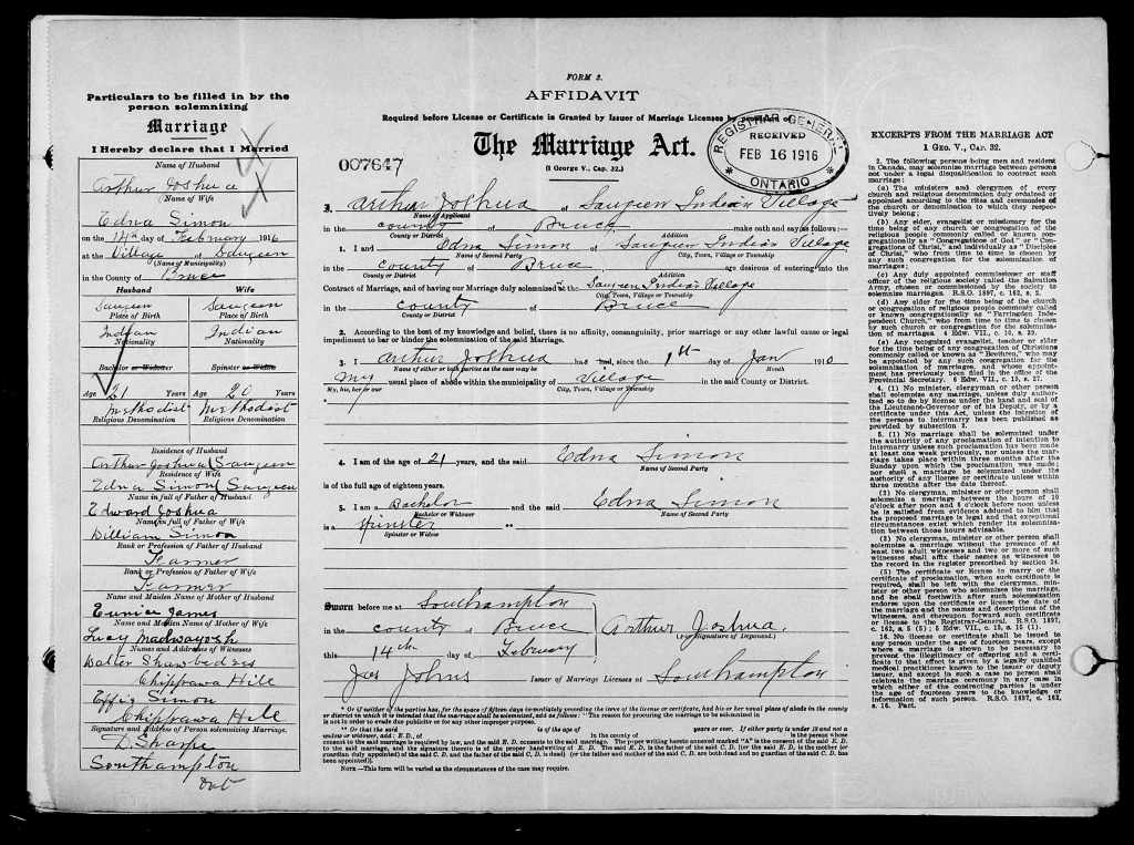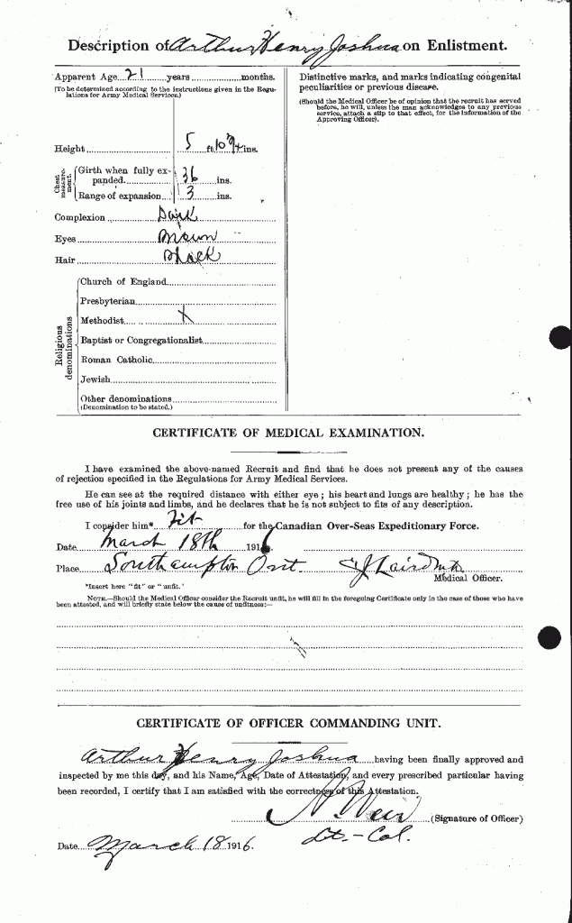 Family Search: When Private Arthur Henry Joshua was born on 29 November 1895, in Canada, his father, Edward Joshua Madwashemind, was 33 and his mother, Eunice James, was 21. He married Edna Simon on 14 February 1916, in Saugeen, Bruce, Ontario, Canada. They were the parents of at least 2 sons and 1 daughter. He lived in Bruce, Ontario, Canada in 1911 and Chippawa Hill, Saugeen 29, Bruce, Ontario, Canada for about 6 years. He registered for military service in 1916. In 1916, at the age of 21, his occupation is listed as labourer in Chippawa Hill, Saugeen 29, Bruce, Ontario, Canada. He died on 19 June 1960, in Southampton, Bruce, Ontario, Canada, at the age of 64, and was buried in Chippawa Hill, Saugeen 29, Bruce, Ontario, Canada.