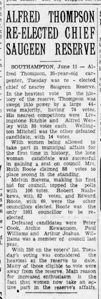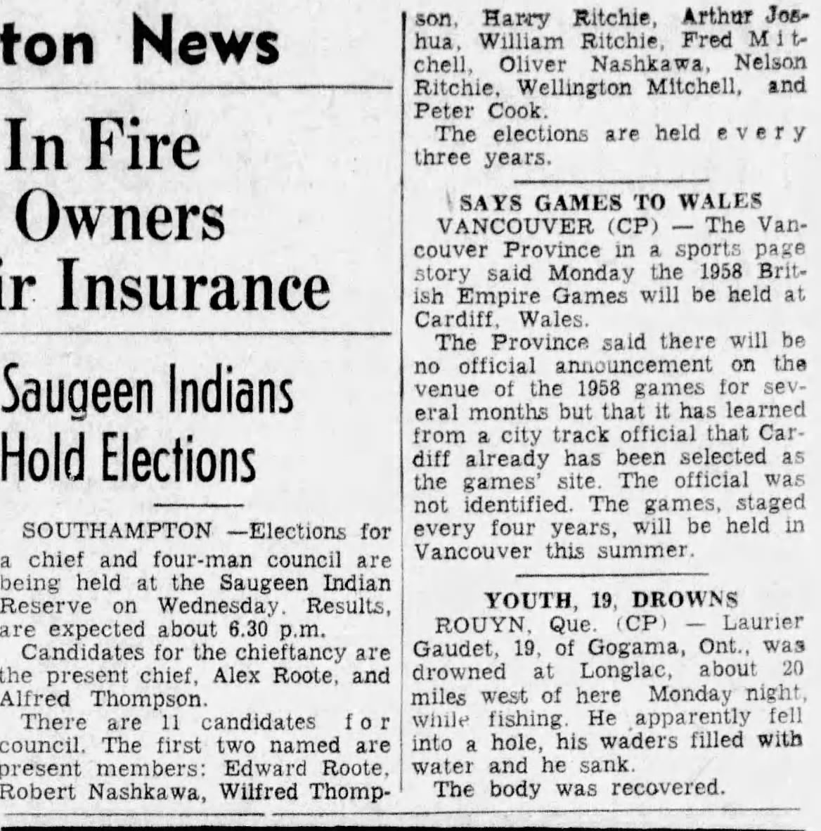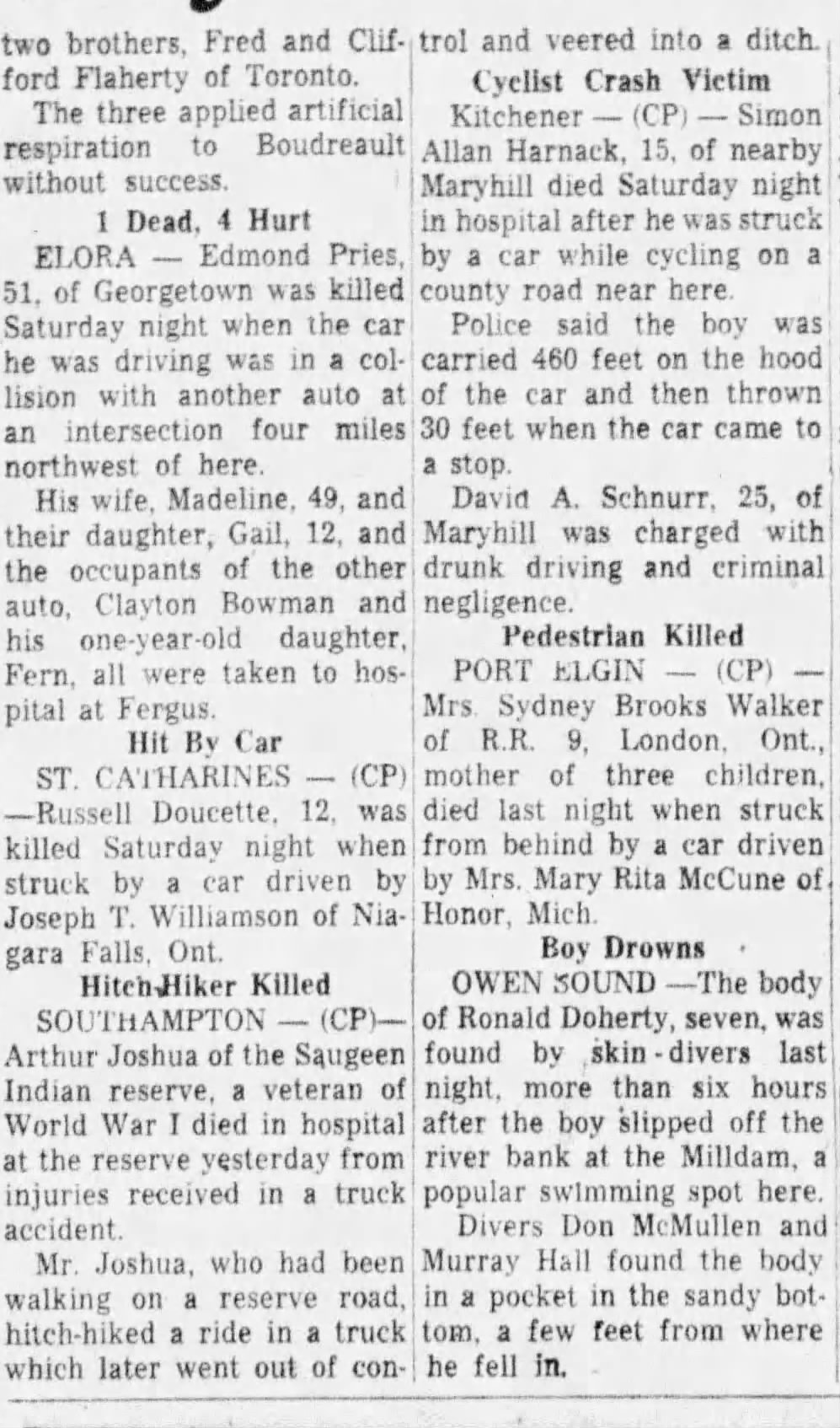 SOUTHAMPTON – Arthur Joshua, 63, of the Saugeen Indian Reserve, died at the Saugeen Memorial Hospital, Southampton, Sunday afternoon, following a motor accident on the first side-road east of the Saugeen Reserve Village, just east of here.