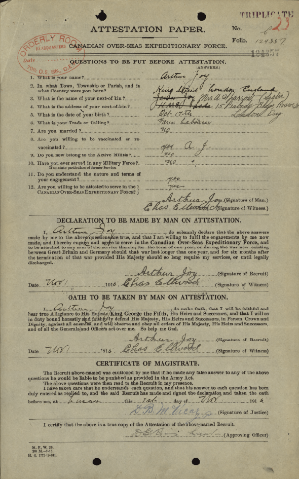 Family Search: Private Arthur Joy was born on 17 October 1896, in London, England, United Kingdom. He immigrated to Halifax, Nova Scotia, Canada in 1910. He registered for military service in 1915. In 1916, at the age of 20, his occupation is listed as farm labourer. He died on 20 May 1922, at the age of 25, and was buried in Brinsley Anglican Cemetery, Brinsley, Middlesex, Ontario, Canada.