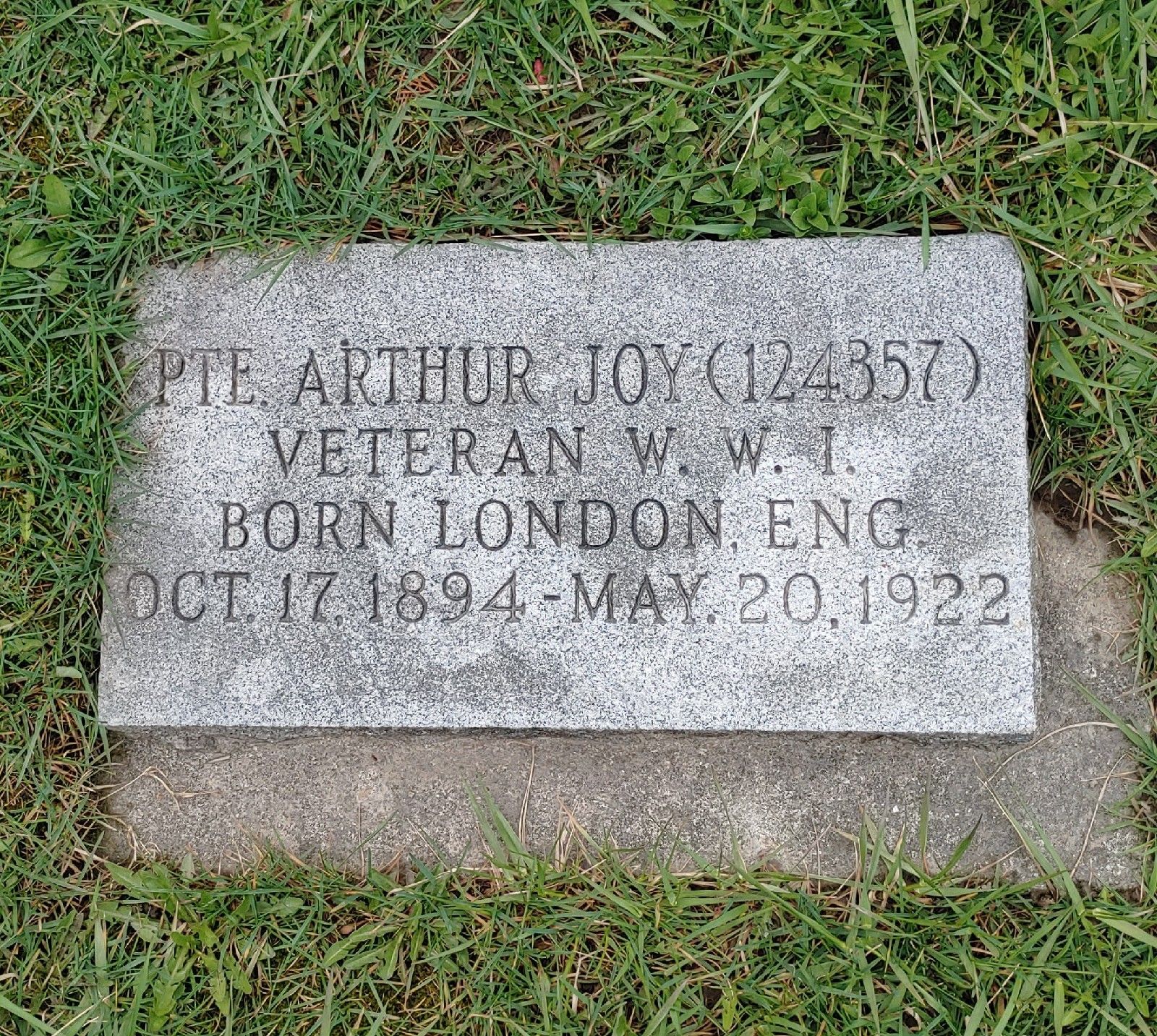 Family Search: Private Arthur Joy was born on 17 October 1896, in London, England, United Kingdom. He immigrated to Halifax, Nova Scotia, Canada in 1910. He registered for military service in 1915. In 1916, at the age of 20, his occupation is listed as farm labourer. He died on 20 May 1922, at the age of 25, and was buried in Brinsley Anglican Cemetery, Brinsley, Middlesex, Ontario, Canada.