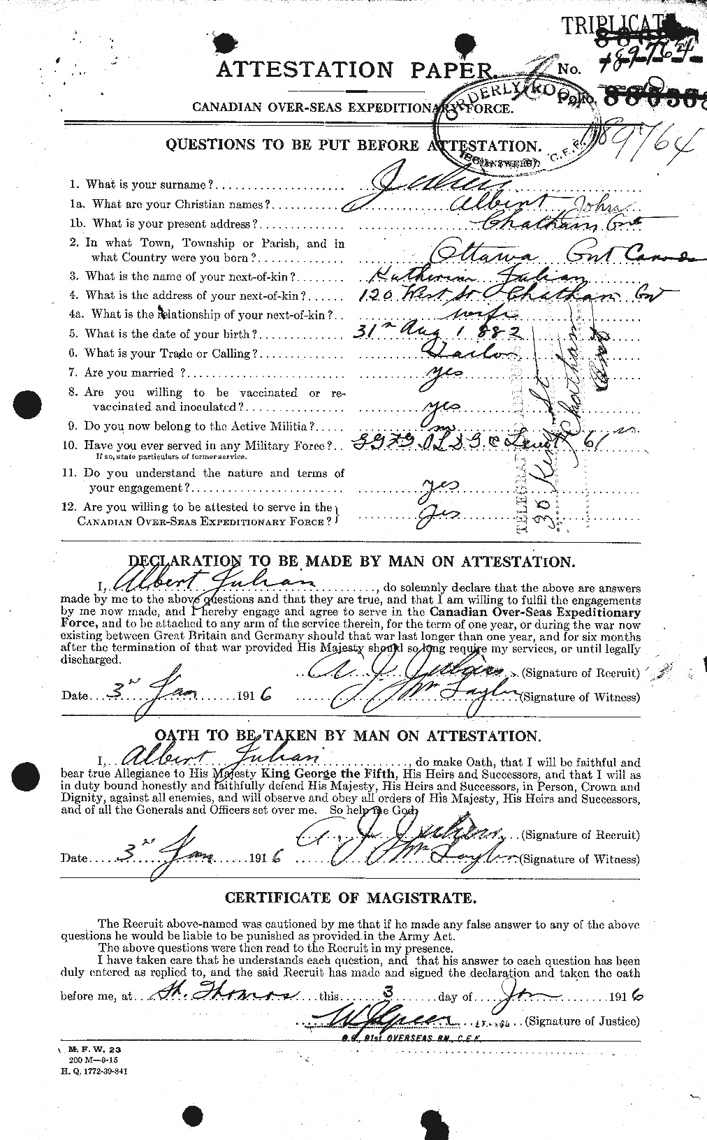 Date Stamped received at Military Headquarters Jan., 7, 1916. Dept. Militia and Defence, Jan.,08-1916 reference 4645-1 CANADA