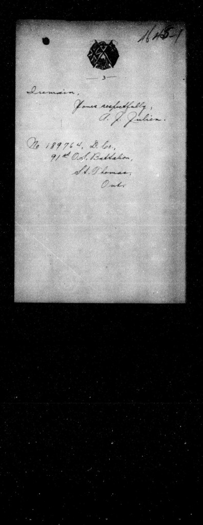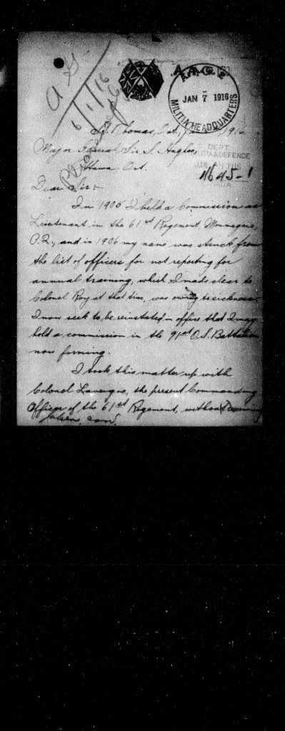 In 1906 I held a Commission as a Lieutenant in the 61st Regiment, [illegible], D.2., and in 1906 my name was struck from the list of officers for not reporting for annual training, which I made clear to Colonel Roy at that time, was owing to sickness. I now seek to be reinstated in office that I hold a commission in the 91st O.S. Battalion now forming.