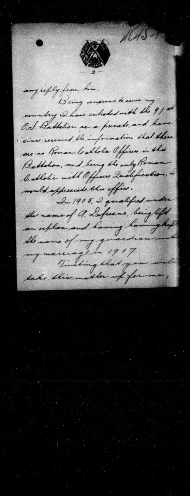 Being anxious to serve my country I have enlisted with the 91st O.S. Battalion as a private and have since received the information that there are no Roman Catholic Officers in this Battalion, and being the only Roman Catholic with Officers Qualifications, I would appreciate this office.