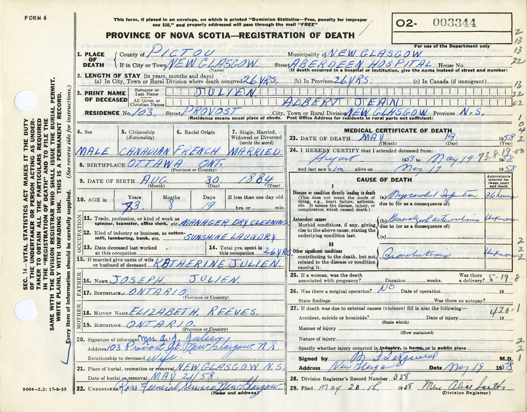 Family Search: When Private Albert Jean Julien was born on 31 August 1884, in Ottawa, Carleton, Ontario, Canada, his father, Napoléon Joseph Julien, was 37 and his mother, Elizabeth Ida Reeves, was 30. He married Myrtle Olive James on 13 November 1899, in Alpena, Alpena, Michigan, United States. They were the parents of at least 1 son. He lived in Chatham, Kent, Ontario, Canada for about 7 years. He registered for military service in 1916. In 1958, his occupation is listed as manager, dry cleaning. sunshine laundry in New Glasgow, Pictou, Nova Scotia, Canada. He died on 19 May 1958, in New Glasgow, Pictou, Nova Scotia, Canada, at the age of 73, and was buried in Holy Cross Cemetery, New Glasgow, Pictou, Nova Scotia, Canada.