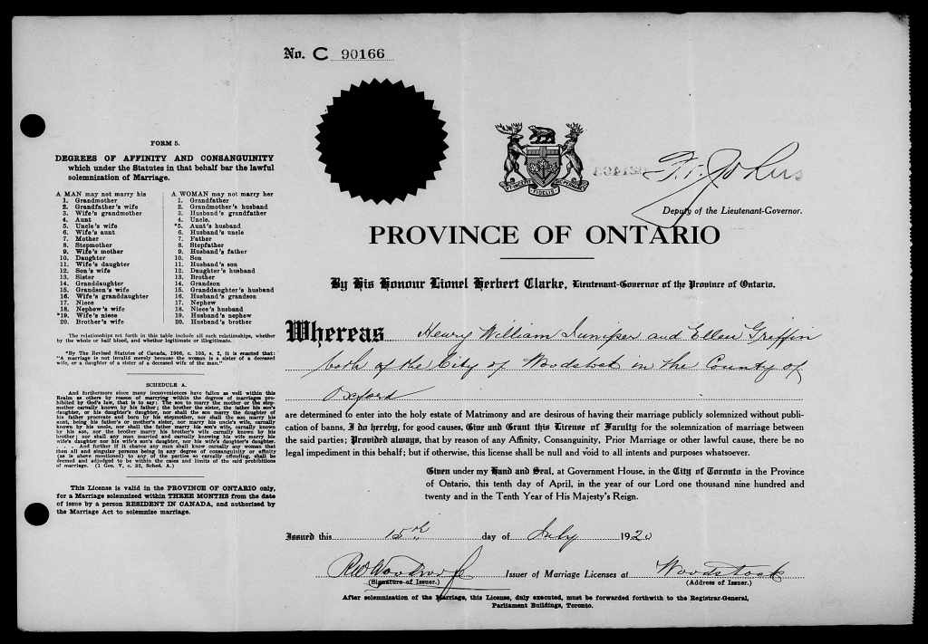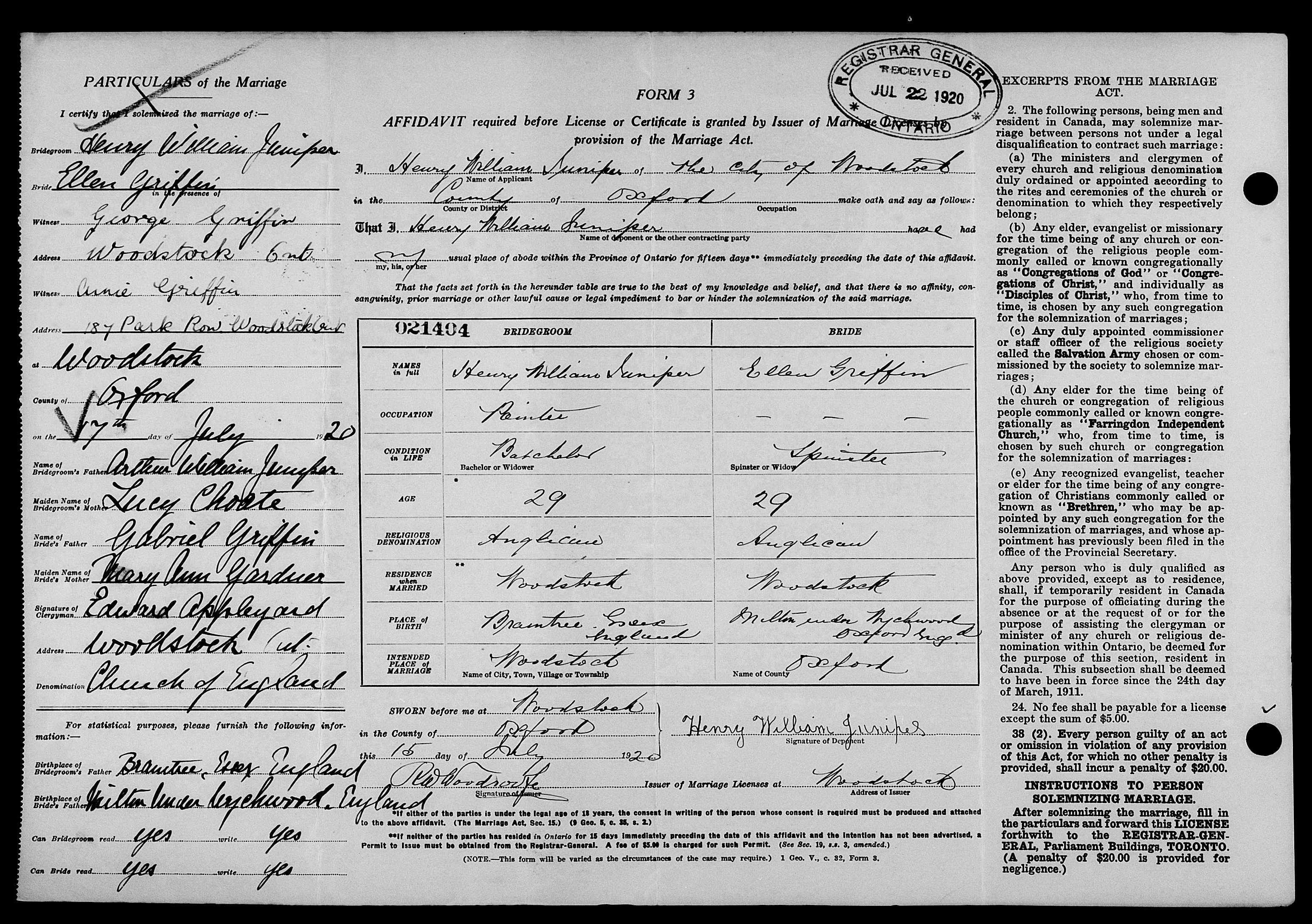 Family Search: When Private Henry William Juniper was born on 28 August 1892, in Braintree, Essex, England, United Kingdom, his father, Willie Benaiah Juniper, was 26 and his mother, Christiana Choat, was 28. He married Ellen Griffin on 17 July 1920, in Woodstock, Oxford, Ontario, Canada. They were the parents of at least 1 son and 1 daughter. He immigrated to Canada in 1913 and lived in St Pancras St Jude Gray’s Inn Road, London, England, United Kingdom in 1911 and Woodstock, Oxford, Ontario, Canada in 1921. He registered for military service in 1914. In 1914, at the age of 22, his occupation is listed as labourer. He died on 15 January 1969, in London, Ontario, Canada, at the age of 76, and was buried in Woodstock, Oxford, Ontario, Canada.