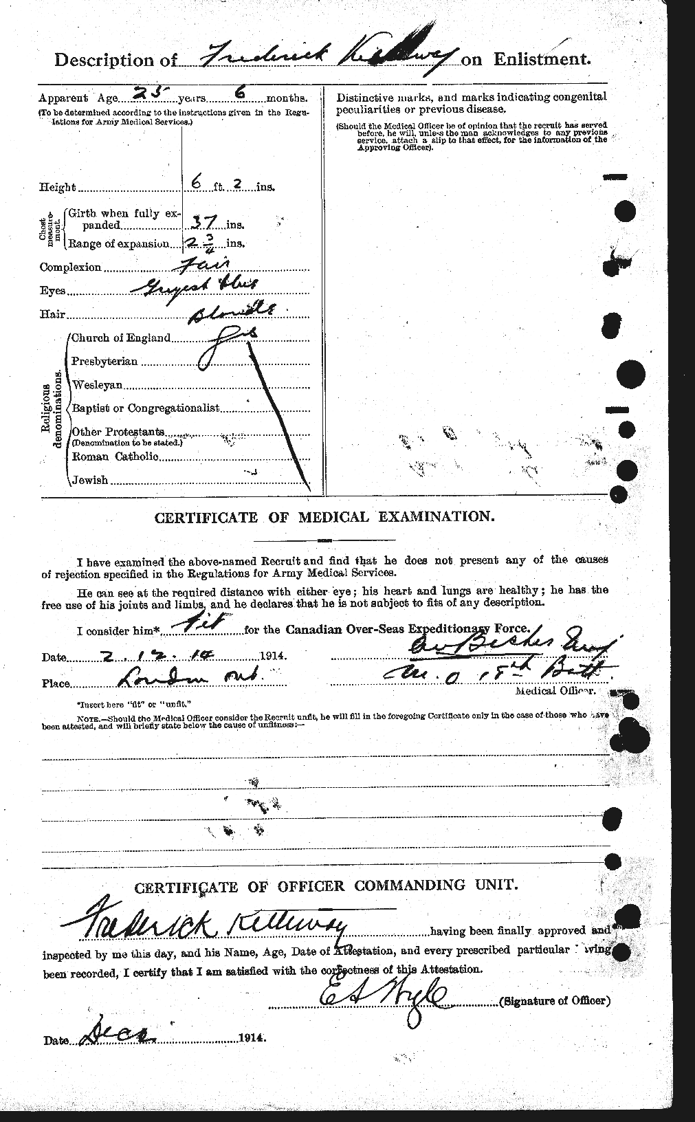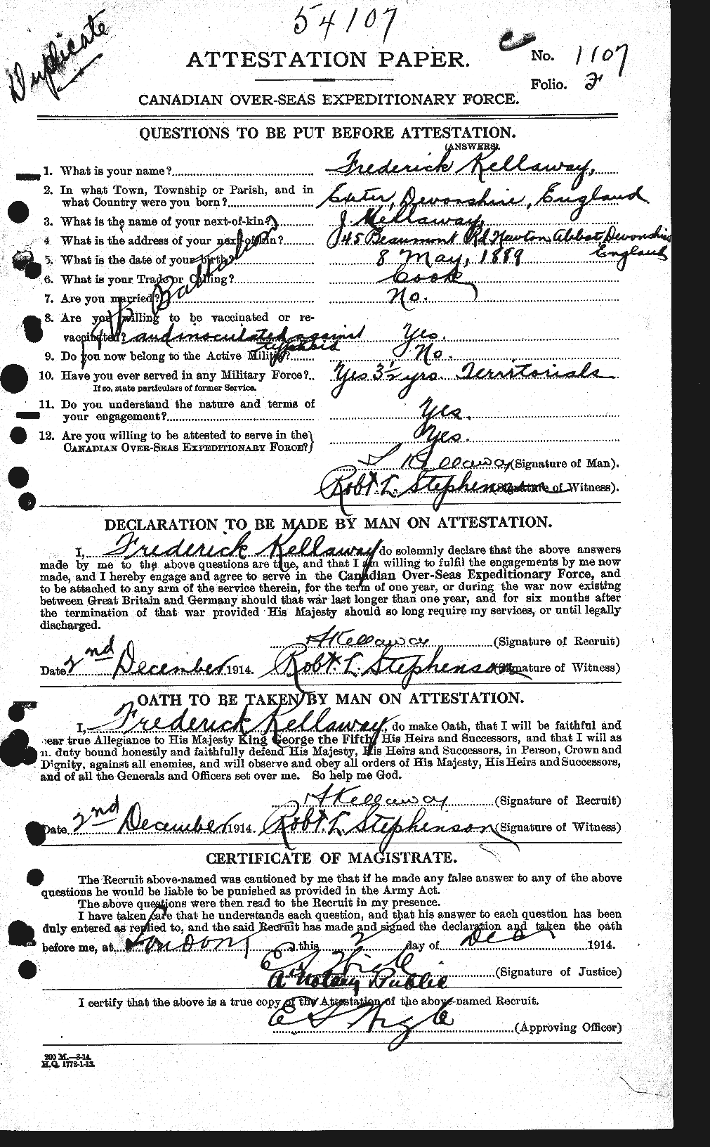 Family Search: When Private Frederick Kellaway was born on 8 May 1889, in Exeter, Devon, England, United Kingdom, his father, John Kellaway, was 32 and his mother, Matilda Kellaway, was 31. He married Dora E. Mogridge in 1919, in Newton Abbot, Devon, England, United Kingdom. He immigrated to Canada in 1914 and lived in Wolborough, Devon, England, United Kingdom for about 10 years and Newton Abbot, Devon, England, United Kingdom in 1921. He registered for military service in 1914. In 1914, at the age of 25, his occupation is listed as cook. He died on 28 July 1953, in Devon, England, United Kingdom, at the age of 64.