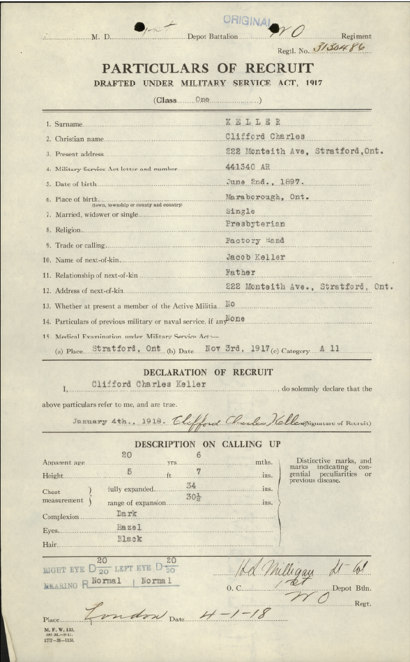 Family Search: When Private Charles Clifford Keller was born on 2 June 1897, in Maryborough Township, Wellington, Ontario, Canada, his father, Jacob S. Keller, was 40 and his mother, Sarah Jane Blough, was 37. He lived in Perth, Ontario, Canada in 1911 and Stratford, Perth, Ontario, Canada for about 13 years. He registered for military service in 1918. In 1931, at the age of 34, his occupation is listed as carpenter. He died in December 1980, at the age of 83, and was buried in Avondale Cemetery, Stratford, Perth, Ontario, Canada.
