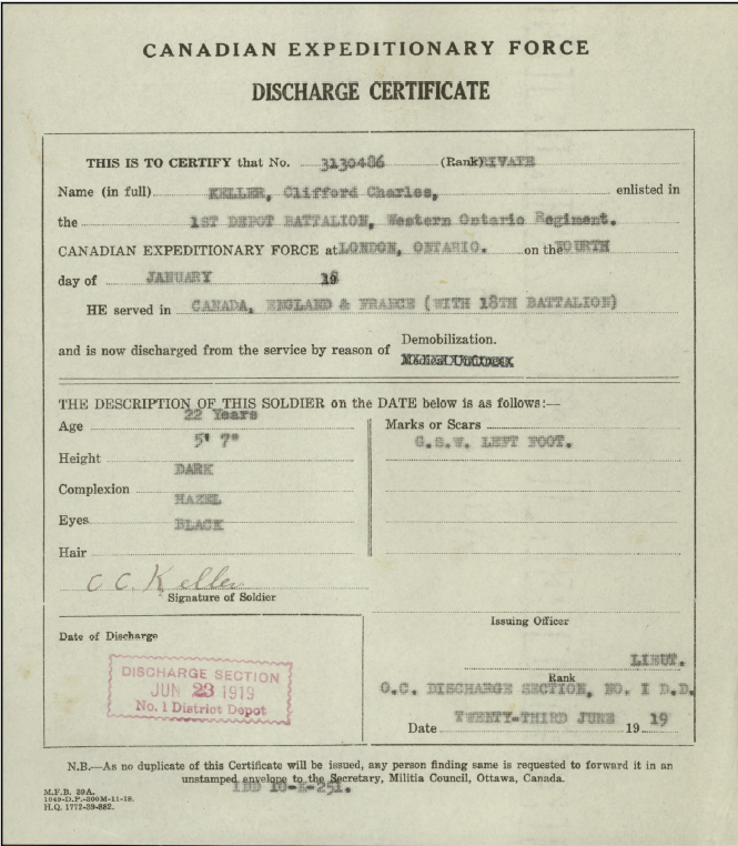 Charles Keller joined the CEF under the 1917 MSA on 4 January 1918 at London, Ontario and was assigned the reg. no. of 3130486. He arrived in England on 16 February 1918 aboard the SS Grampian and by 3 June 1918 he was transferred to the 18th Battalion for active combat duty. He arrived “in the field” with the 18th Battalion on 14 August 1918 and was wounded on the 27th. He suffered a GSW to his left foot and was sent to England for treatment.