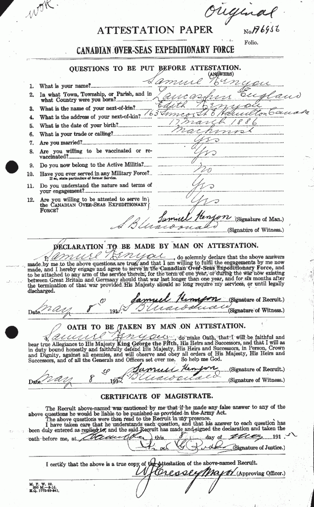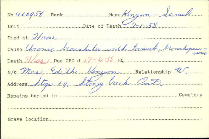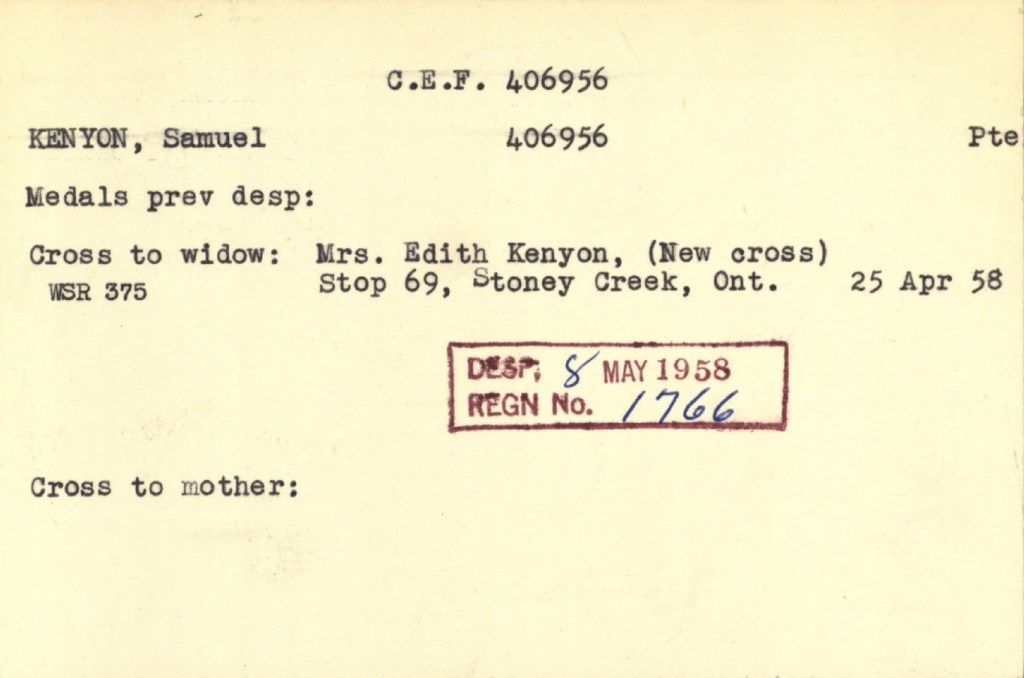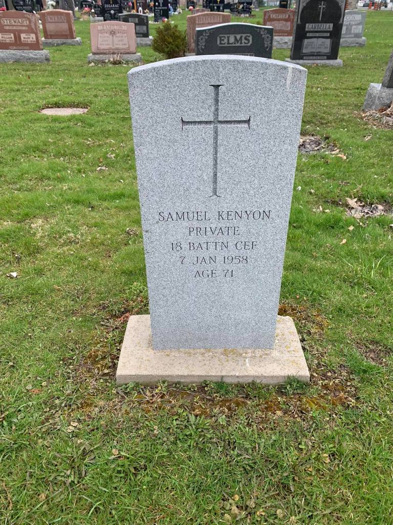 Kenyon, Samuel: Service no. 406956 Digitized Service Record Source: Per post with headstone at 18th Battalion Group by Mark Carmichael. Find-A-Grave Contributed per post with headstone at 18th Battalion Group by Mark Carmichael. Share this: Click to email a link to a friend (Opens in new window) Email Click to share on Facebook (Opens in new window) Facebook Click to share on X (Opens in new window) X Click to share on Reddit (Opens in new window) Reddit Click to share on LinkedIn (Opens in new window) LinkedIn Click to print (Opens in new window) Print Click to share on Tumblr (Opens in new window) Tumblr Click to share on Pocket (Opens in new window) Pocket Click to share on Pinterest (Opens in new window) Pinterest Click to share on Telegram (Opens in new window) Telegram Click to share on WhatsApp (Opens in new window) WhatsApp Like Loading...