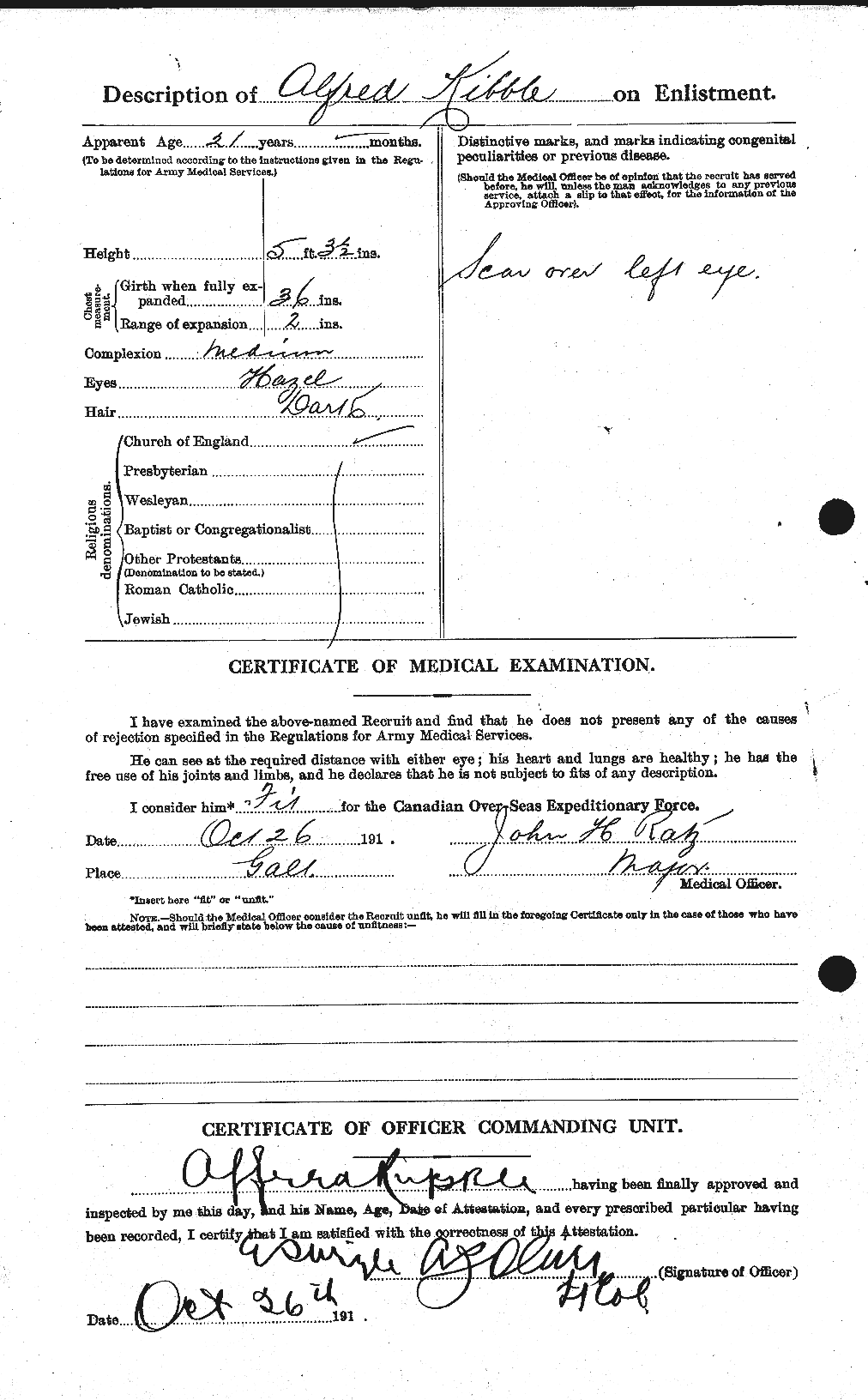 | March 13, 1919 | Medical for Discharge | Medical exam upon discharge from the CEF at Seaford, England. |