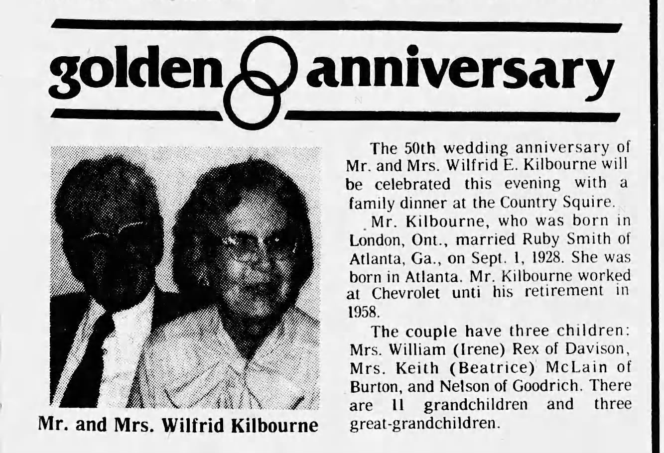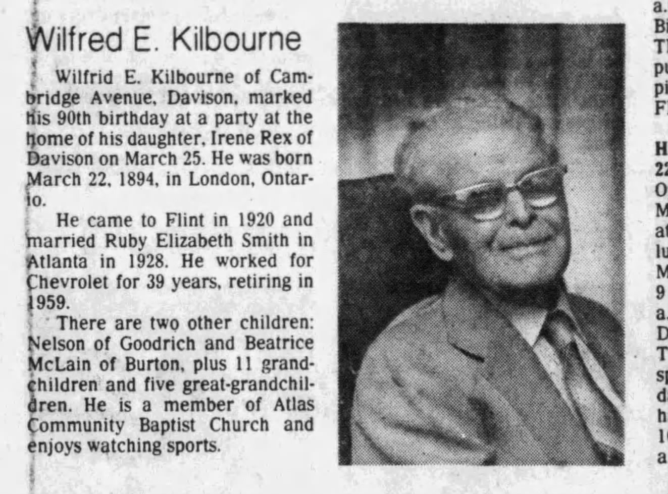 Family Search: When Wilfrid Edward Kilbourne was born on 22 March 1894, in Oxford, Ontario, Canada, his father, Byron Kilborne, was 46 and his mother, Alice Maud Teeple, was 25. He had at least 1 son and 2 daughters with Ruby Elizabeth Smith. He immigrated to Detroit, Wayne, Michigan, United States in 1920 and lived in Tarrytown, Greenburgh, Westchester, New York, United States in 1935 and Baltimore, Baltimore, Maryland, United States in 1940. He registered for military service in 1915. He died on 19 June 1988, in Davison, Genesee, Michigan, United States, at the age of 94, and was buried in Crestwood Memorial Cemetery, Grand Blanc, Genesee, Michigan, United States.