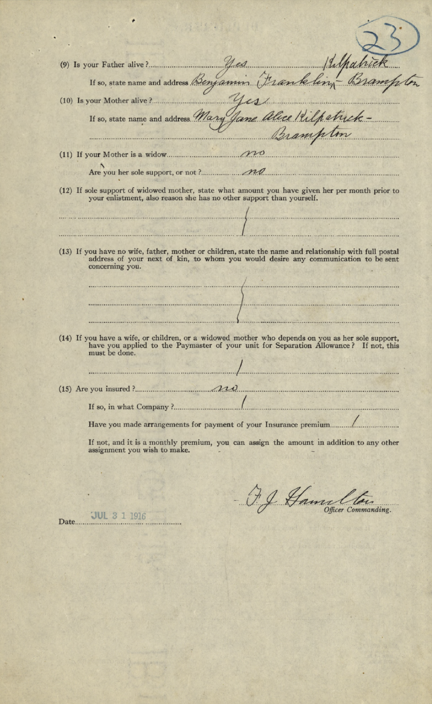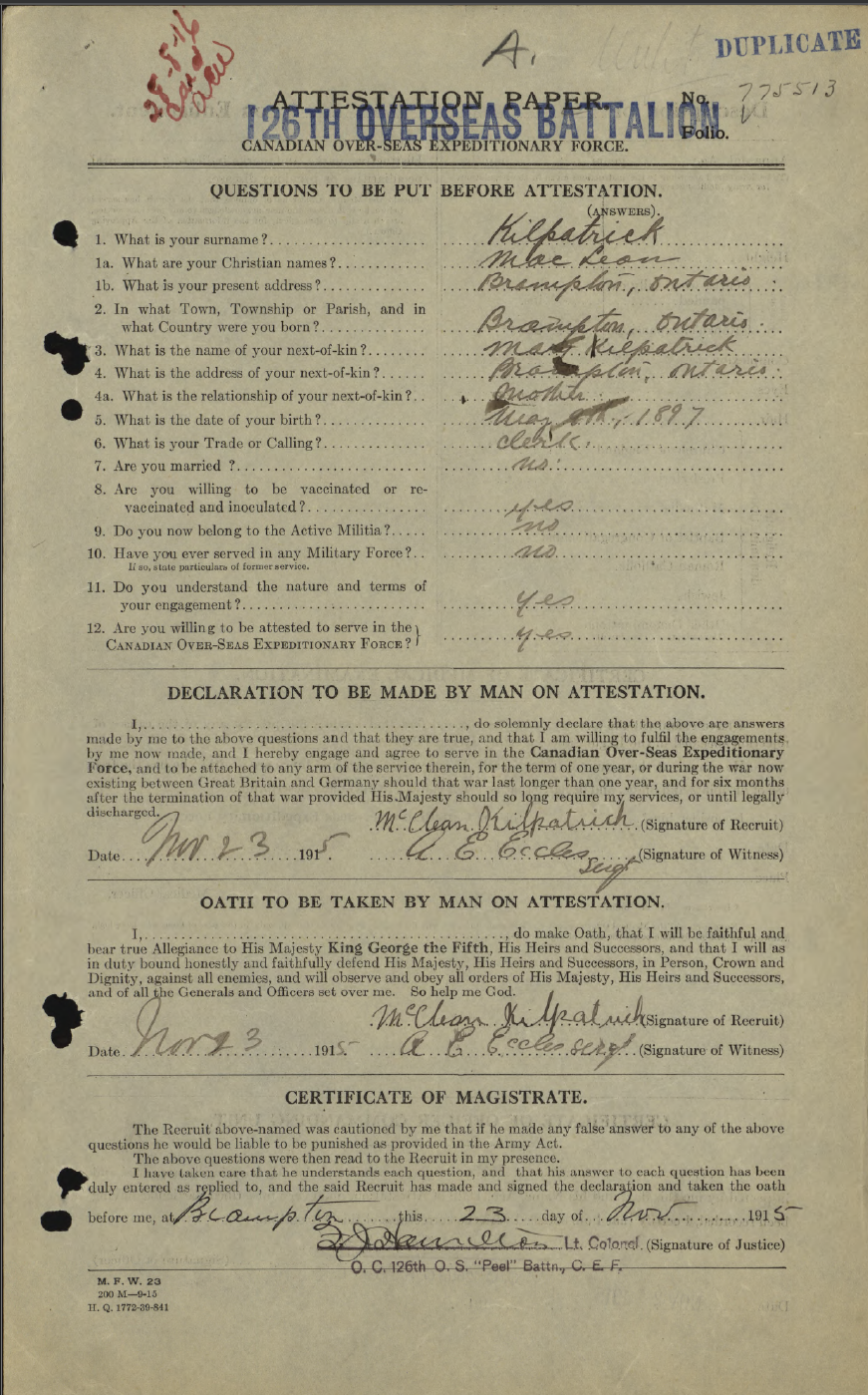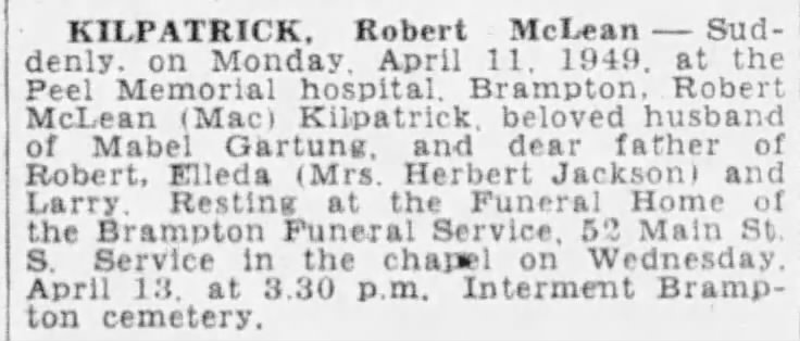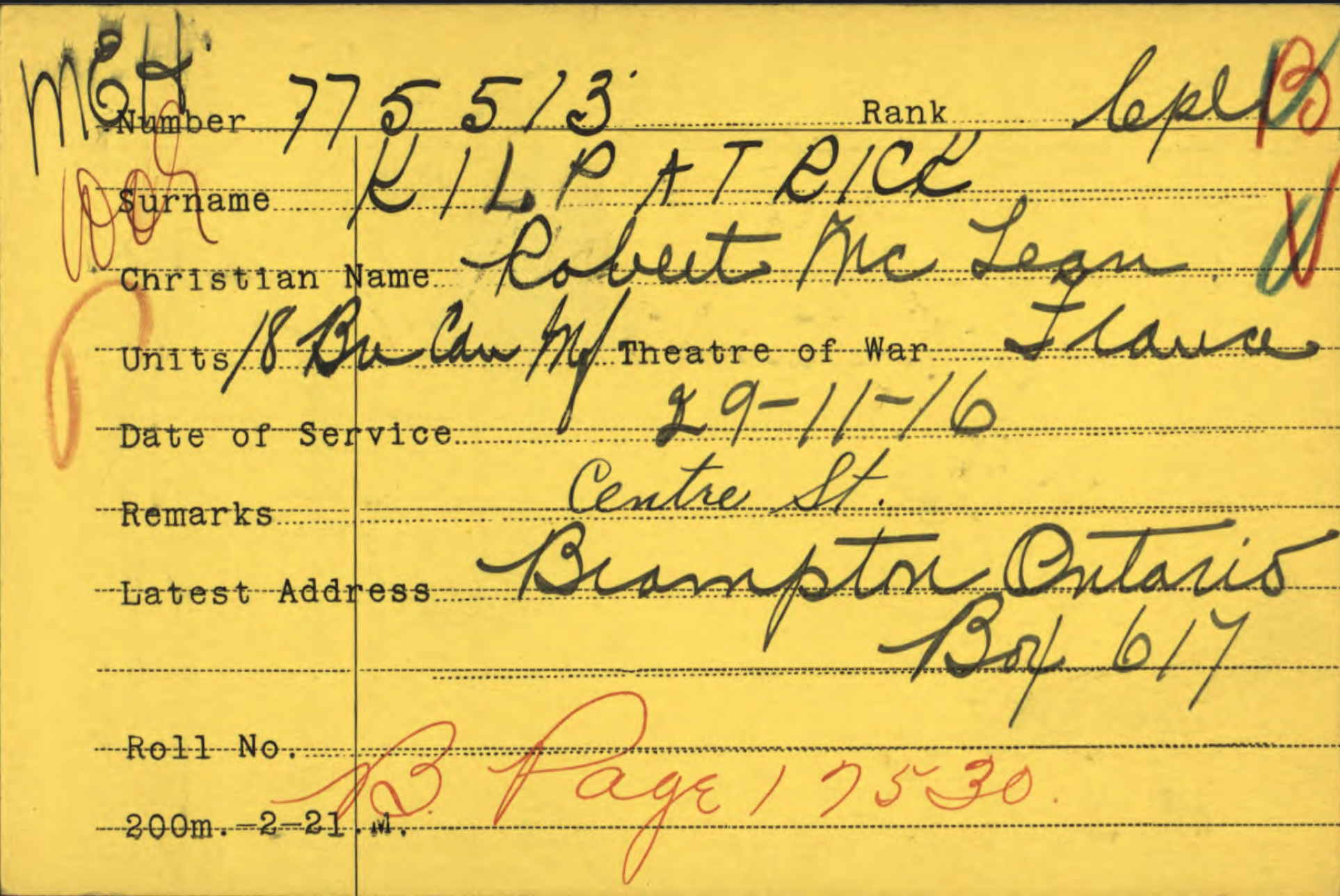 Family Search: When Corporal Robert McClean Kilpatrick was born on 9 May 1897, in Brampton, Peel, Ontario, Canada, his father, Benjamin Kilpatrick, was 38 and his mother, Mary Jane Alice Bracken, was 30. He married Mabel Winnifred Gartung on 10 April 1920, in Brampton, Peel, Ontario, Canada. They were the parents of at least 2 sons and 1 daughter. He lived in Ontario, Canada in 1911. He registered for military service in 1915. In 1949, his occupation is listed as building superintendant in Brampton, Peel, Ontario, Canada. He died on 11 April 1949, in Brampton, Peel, Ontario, Canada, at the age of 51, and was buried in Brampton Cemetery, Brampton, Peel, Ontario, Canada.